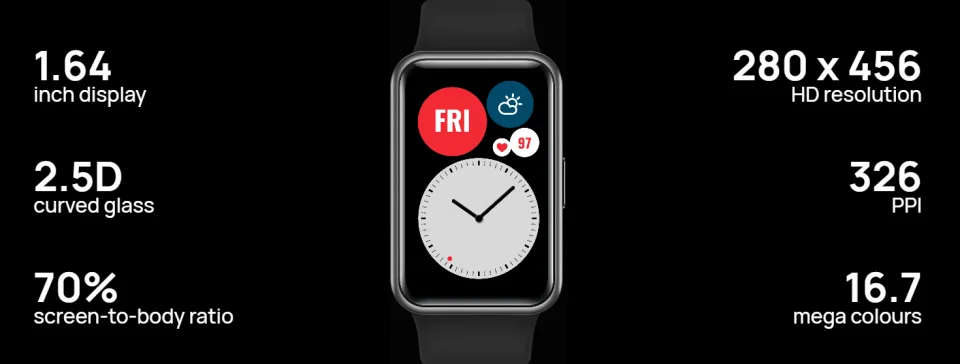 Благодаря великолепному прямоугольному AMOLED-дисплею 1,64 дюйма и разрешению 280x456 HD, HUAWEI WATCH FIT обеспечивает ультрачеткий и широкий обзор. Автоматическая регулировка яркости обеспечивает лучший обзор при солнечном свете, в то время как циферблаты six Always-On3 позволяют выразить свой индивидуальный стиль и настроение в любой данный день.