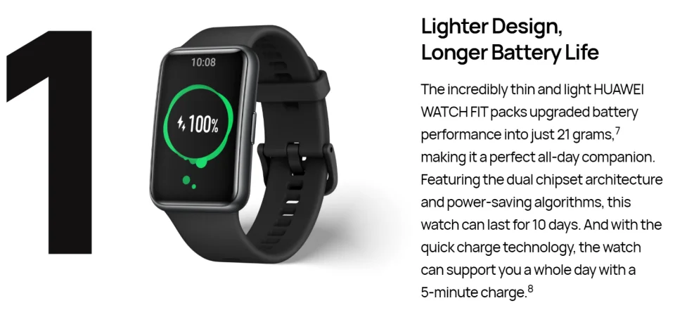Невероятно тонкие и легкие часы HUAWEI WATCH FIT позволяют повысить производительность батареи всего до 21 грамма, что делает его идеальным спутником на весь день. Благодаря архитектуре двойного чипсета и энергосберегающим алгоритмам эти часы могут работать в течение 10 дней. Благодаря технологии быстрой зарядки часы могут поддерживать вас целый день с 5-минутной зарядкой 8.