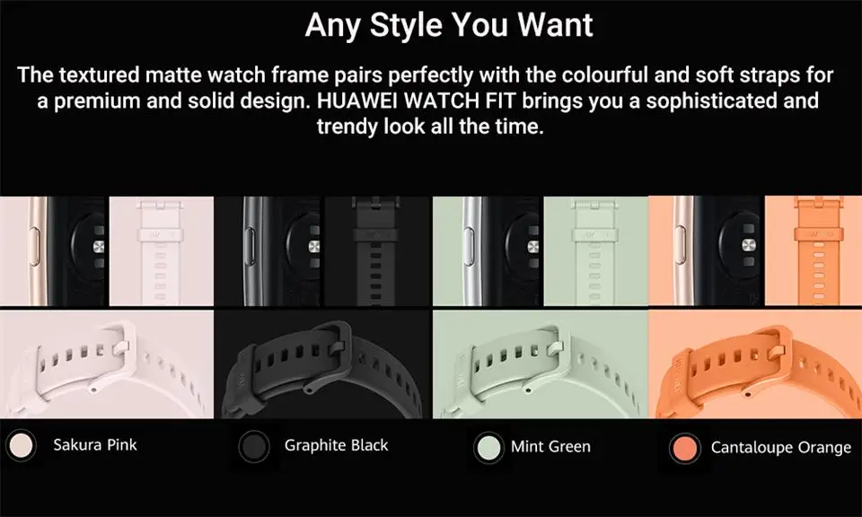Текстурированная Матовая рамка часов идеально сочетается с красочными и мягкими ремешками для премиального и прочного дизайна. HUAWEI WATCH FIT придает вам изысканный и модный вид постоянно.