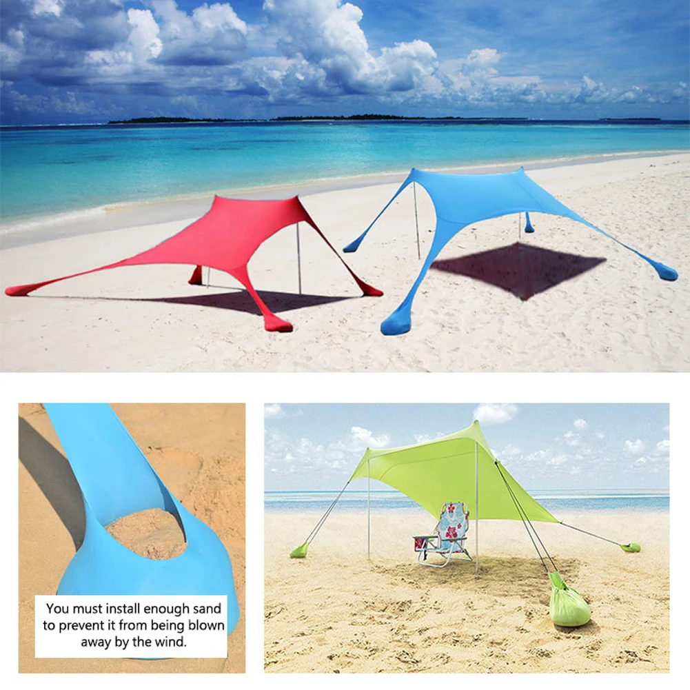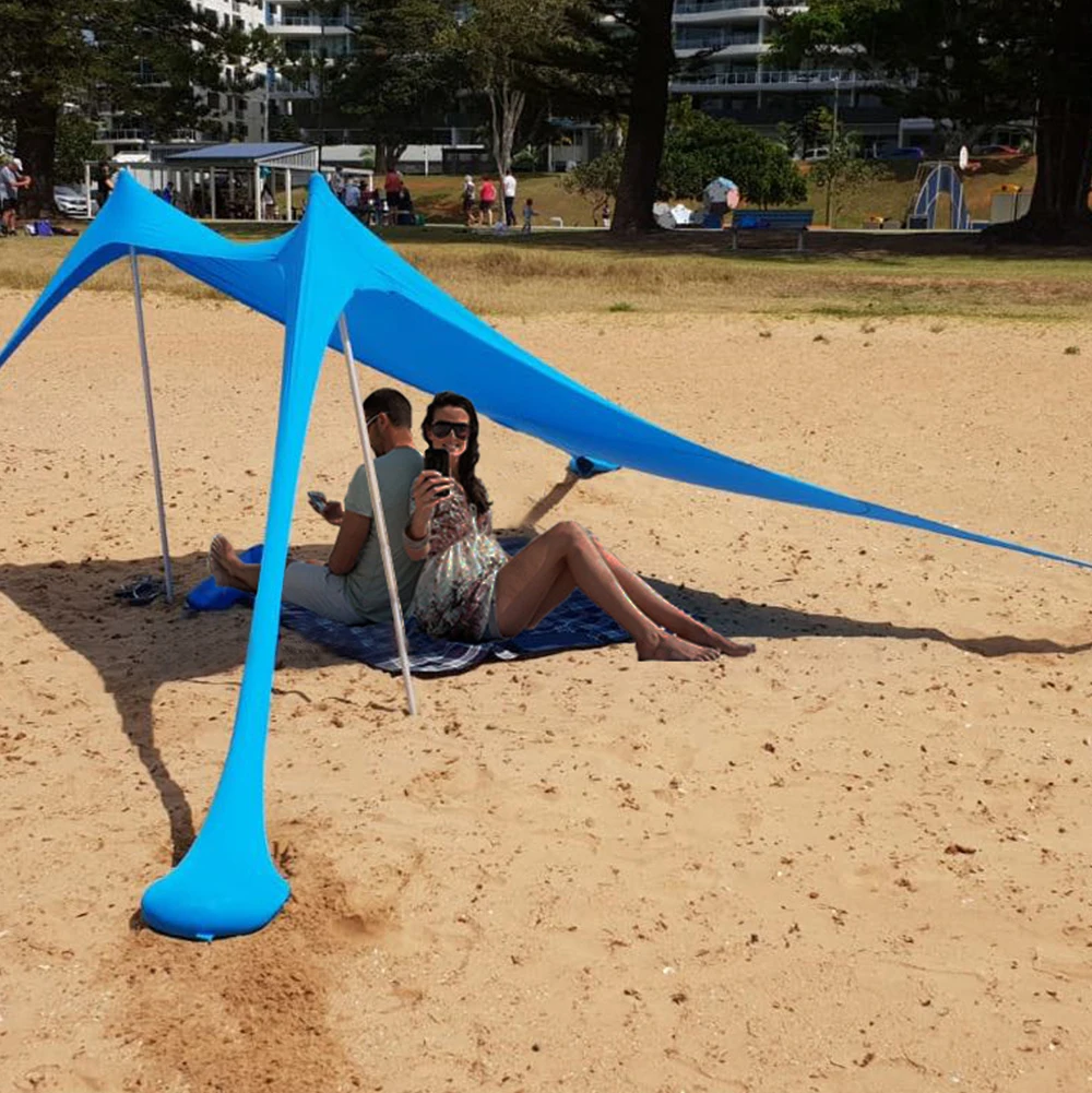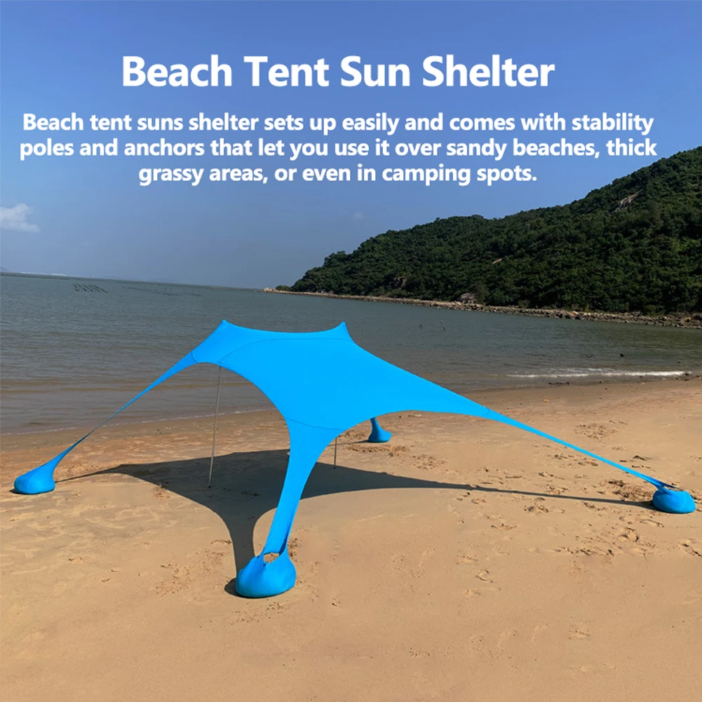 Пляжный Тент suns shelter легко устанавливается и поставляется с стойкими полюсами и якорем, которые позволяют использовать его над песчаными пляжами, густыми травяными зонами или даже в местах для кемпинга.