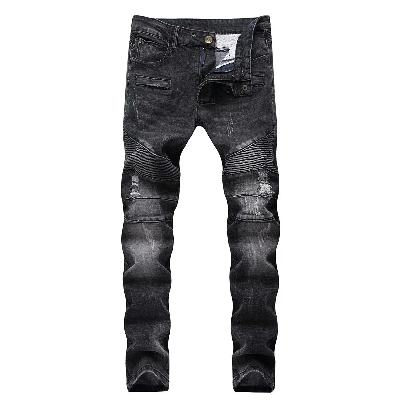 Мужские байкерские джинсы с потертостями, плиссированные облегающие мужские джинсы, растягивающиеся, джинсовые штаны