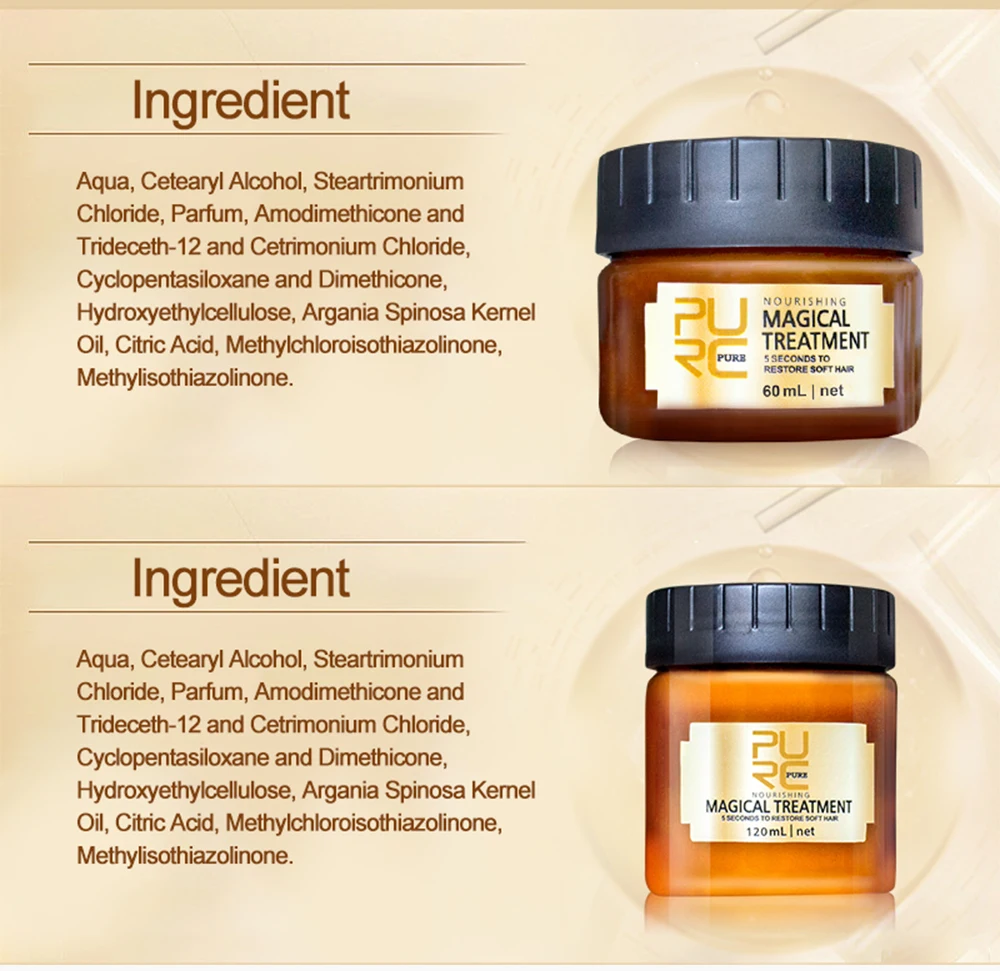 Brand Name: PURC Origin: CN(Origin) NET WT: 60 ml Model Number: PURE hair Magical treatment Quantity: 1pcs Ingredient: Argan oilItem Type: Hair & Scalp Treatment Feature: 5 seconds to repair damaged hair Function: Make hair soft and smooth Operate: 2-5 minutes operate