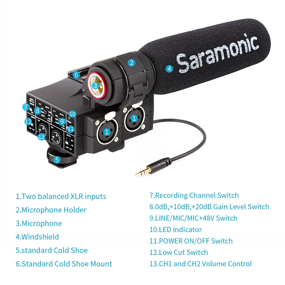 Набор адаптеров Saramonic Mixmic и микрофонов включает SR-NV5 микрофон и адаптер, что позволяет подключать камеру к микрофонам профессионального уровня, микшерным консолям и звукостудиям. Адаптер оснащен двумя pro-standard XLR клеммами для максимальной гибкости работы, обеспечивая раздельное управление громкостью двух каналов, настройку усиления и снижение шума от ветра. Переключение ввода микрофона/линии позволяет записывать подробные уровни записи и управлять низкочастотным звуком.