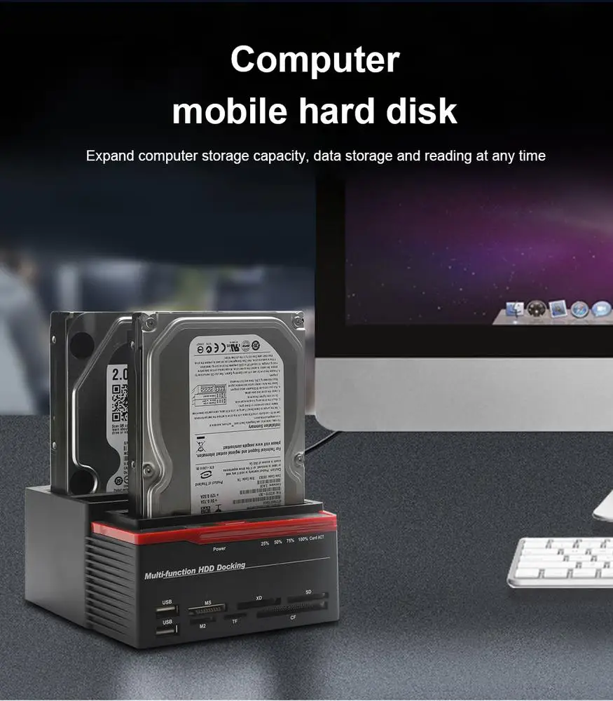 Введение: док-станция «Все в одном» с двумя отсеками обеспечивает легкий доступ к двум 2,5-дюймовым и 2,5-дюймовым ssd SATA I II HDD, двум жестким дискам 6 Тб с концентраторами USB 2,5, И USB 2,0/1,1 сзади. Поддерживает клонирование жестких дисков, высокоскоростной жесткий диск с исходным кодом «один в один», определение местоположения жестких дисков без подключения к компьютеру. Никаких инструментов, установка драйвера не требуется, подключи и работай, горячая поддержка. Он имеет 5 слотов для хранения нескольких карт памяти и поддерживает карты до 32 Гб для легкого и быстрого доступа к медиафайлам. Светоизлучающие диодные индикаторы показывают статус чтения/записи и питание привода, четко и легко.
