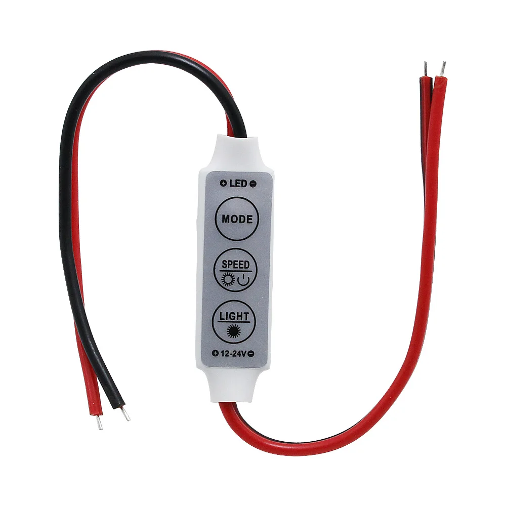 Это совершенно новый одноцветный светодиодный контроллер. Этот продукт имеет мощные функции и небольшой размер, он представляет несколько динамических моделей, приносит новое приложение для украшения одного цвета светодиодный. Кроме того, он может использоваться как светодиодный диммер. Вы можете легко изменить динамический режим, Скорость и яркость, нажав 3 клавиши на тонком корпусе. Он также имеет функцию автоматического запоминания. Это лучший помощник для ваших светодиодный-полосок.