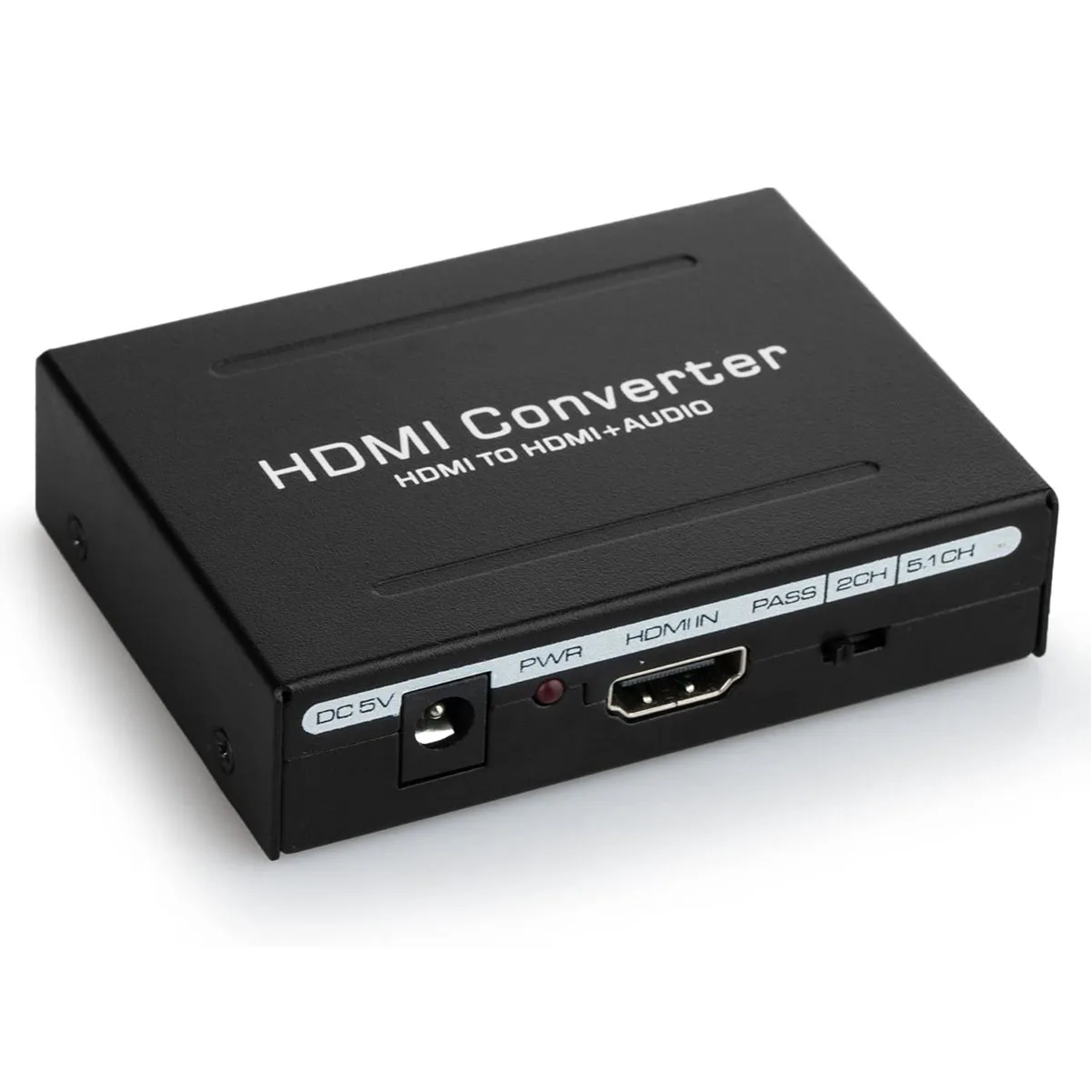1. Support audio output: SPDIF+ analog R/L 2. Input support: up to 1080P (50/60 Hz) 3. Connect the HDMI signal source to a single HDMI display device (such as a TV, projector) and independently output the stereo +SPDIF signal to realize the audio synchronization separation of the HDMI signal. 4. It can realize audio synchronization and separate output, and there are three audio modes: PASS, 2.0CH and 5.1CH to choose from. 5. No signal loss. 6. Simple installation, external DC5V/1A power supply.