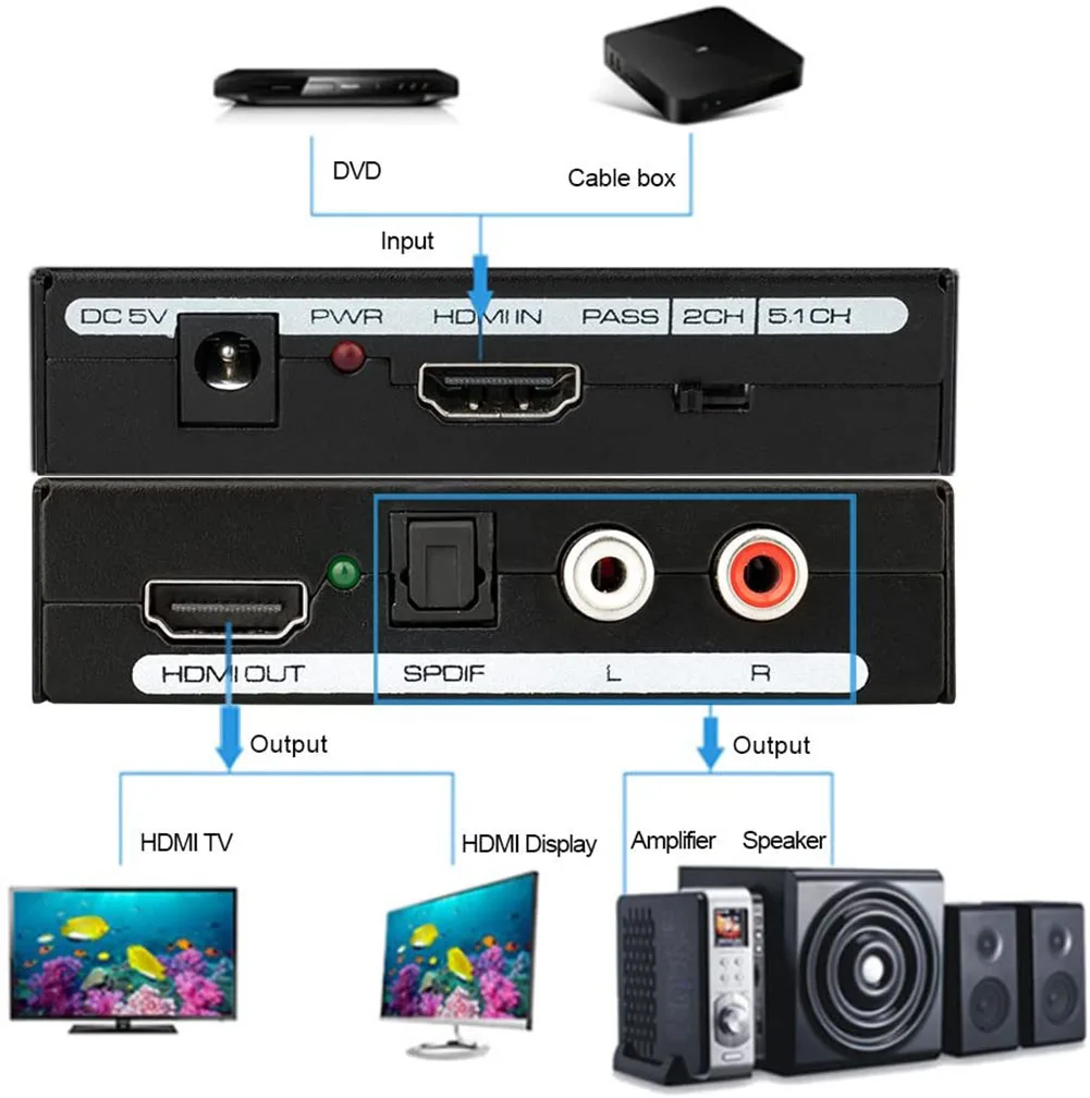 One HDMI input convert to one HDMI+ Audio (SPDIF+R/L)output.Note:This HDMI Audio Extractor Can Not Work With HDMI Switch and HDMI Splitter SPDIF Output Supports Upto DD & DTS 5.1CH Audio; RCA Analog L/R Output Supports 2CH PCM Stereo Audio Supports 24 bit /deep color 30bit, 36bit per channel (36bit all channel) deep color. Supports HDCP, Video Pass Through; Plug & Play supports AppleTV and various Blu-ray player Audio Settings: 2CH for L/R or SPDIF stereo output; 5.1CH for SPDIF Output, Supports uncompressed audio such as LPCM. Supports compressed audio such as DTS Digital, Dolby Digital(Dolby Digital Plus not supported) Provides the Best Flexibility through Three NEW Audio EDID Settings: Pass, 2CH and 5.1CH, Support 3D video (To get 3D, all units connected to the splitter outputs must support 3D). This item supports Apple TV and various Blu-ray player and satellite receivers,Xbox one,Wii U/ PS3 PS4/raspberry.