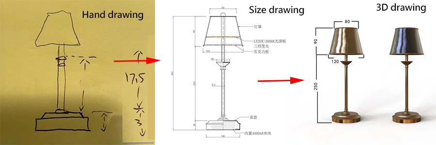 1. Ручной чертеж клиента2.Предлагаем 3D-рисунок и рекомендуемый параметр лампы для справки.3. После обсуждения с клиентом и подтверждения заказа, мы можем сделать образец руки.