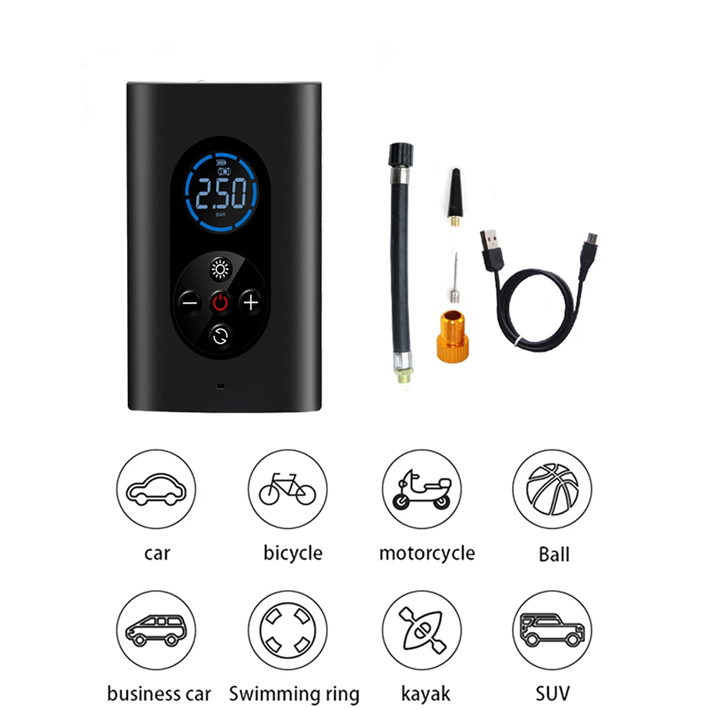 4 в 1, беспроводной воздушный насос, интеллектуальная инфляция, внешний аккумулятор, светодиодный светильник, измерение давления в шинах.