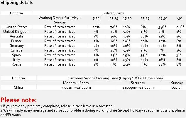 Мы отправляем посылка обычной авиапочтой, если вы хотите выбрать более быстрый способ доставки, такой как EMS, DHL. . Пожалуйста, свяжитесь с нами как можно скорее.Доставка осуществляется только по подтвержденным адресам доставки, пожалуйста, убедитесь, что адрес указан правильно при оплате.Доставка занимает 10-25 рабочих дней, выходные и праздничные дни не включены; Время доставки может варьироваться, особенно из-за таможенного оформления и в течение hodiday сезона. Если вы не можете получить ваш товар в течение 30 дней с даты оплаты и информация об отслеживании не обновляется в течение длительного времени, пожалуйста, свяжитесь с нами, чтобы проверить проблему.