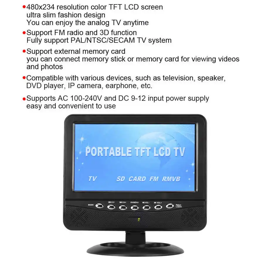 Features:- 7.5 inch 480x234 resolution color TFT LCD screen, ultra slim fashion design. You can enjoy the analog TV anytime.