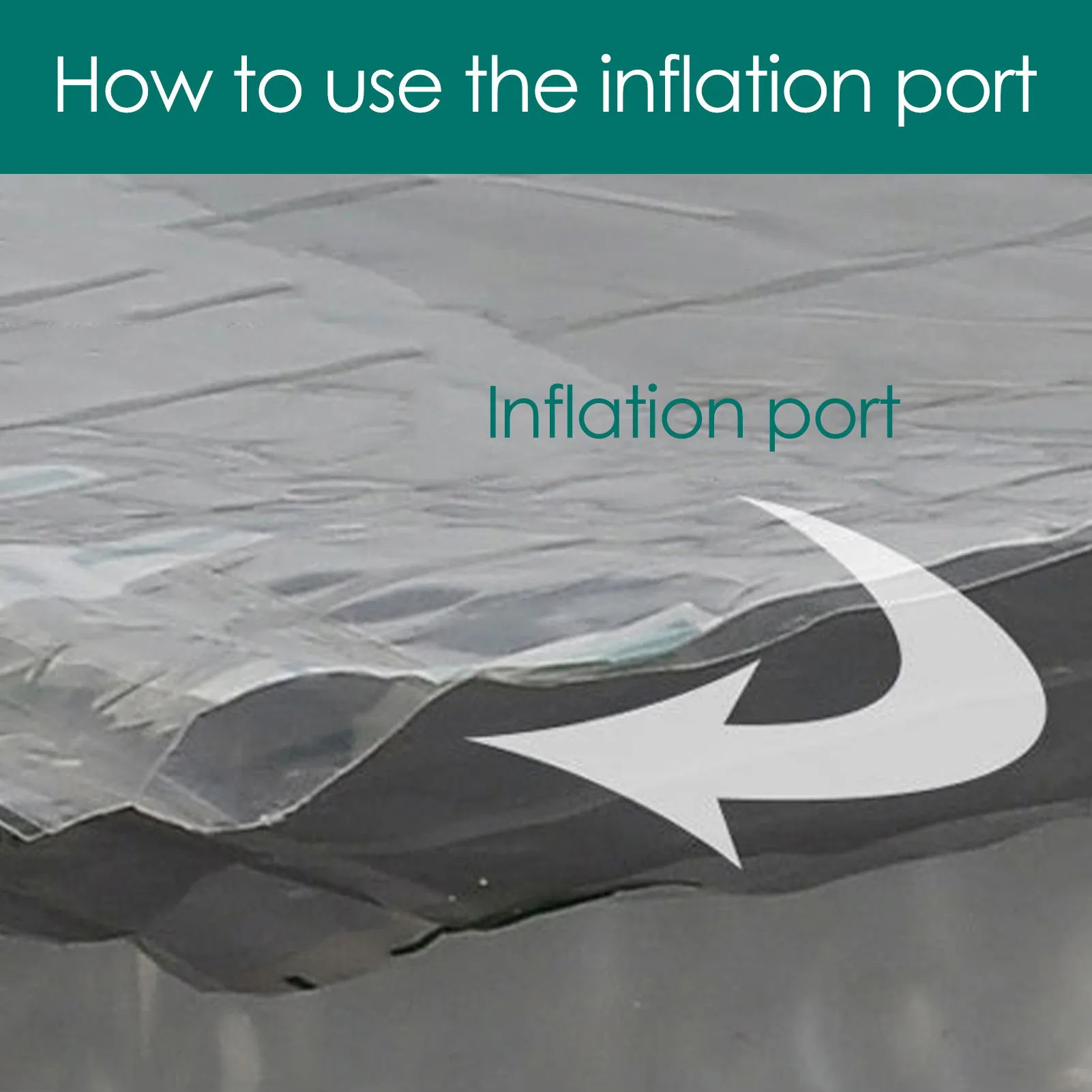 2、Easy to Use: Find the iation hole at the collar of the bag. The green arrow-like sign indicates the direction of the air. Use the provided hand-held air pump. Plug the air pump nozzle into the iation hole, and then blow up the bubble bag. Please do not over-iate it for that may cause damage.