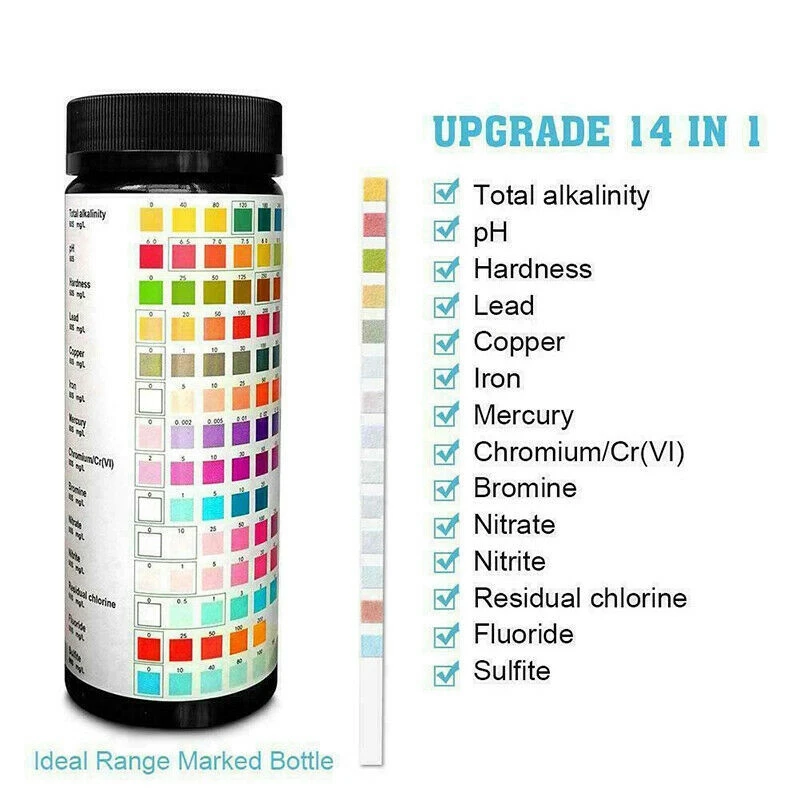 14-в-1 полный химический Тесты ING-Тесты общая Щелочность, pH Измеритель Твердости, без содержания свинца и меди, железа, не содержит ртути, хрома/хромовая отличная машина (VI), брома, нитрат, нитрит остаточный хлор, фторид, сульфит. Эти 14 тестов предоставляют обширную информацию для сохранения баланса воды в бассейне и кристально чистой.