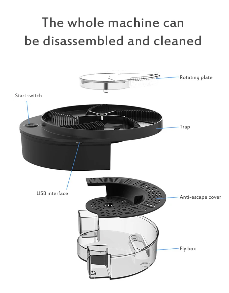 Мухи привлекают приманку и переносятся в коробку вращающейся пластиной.