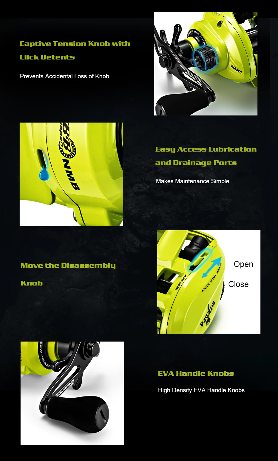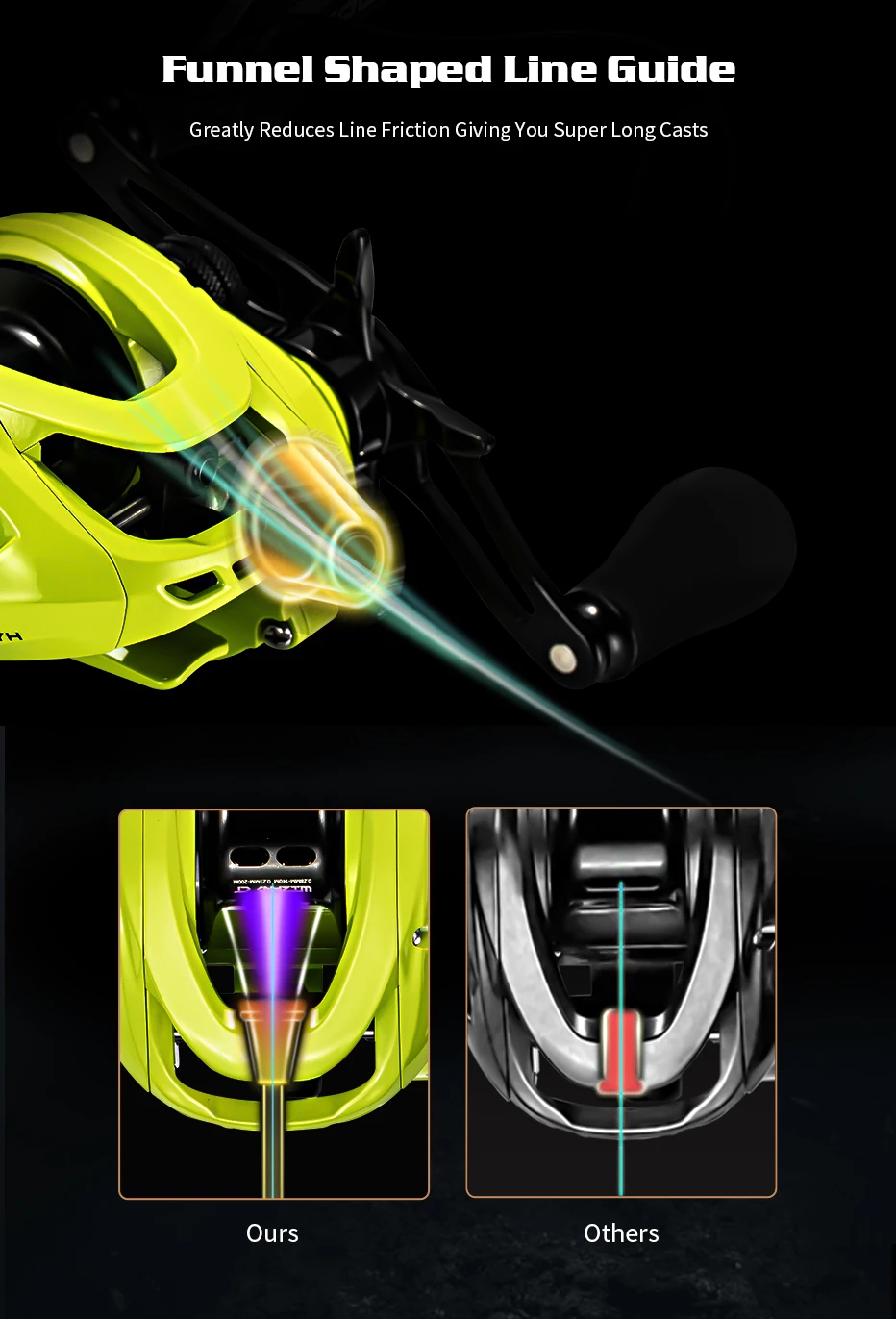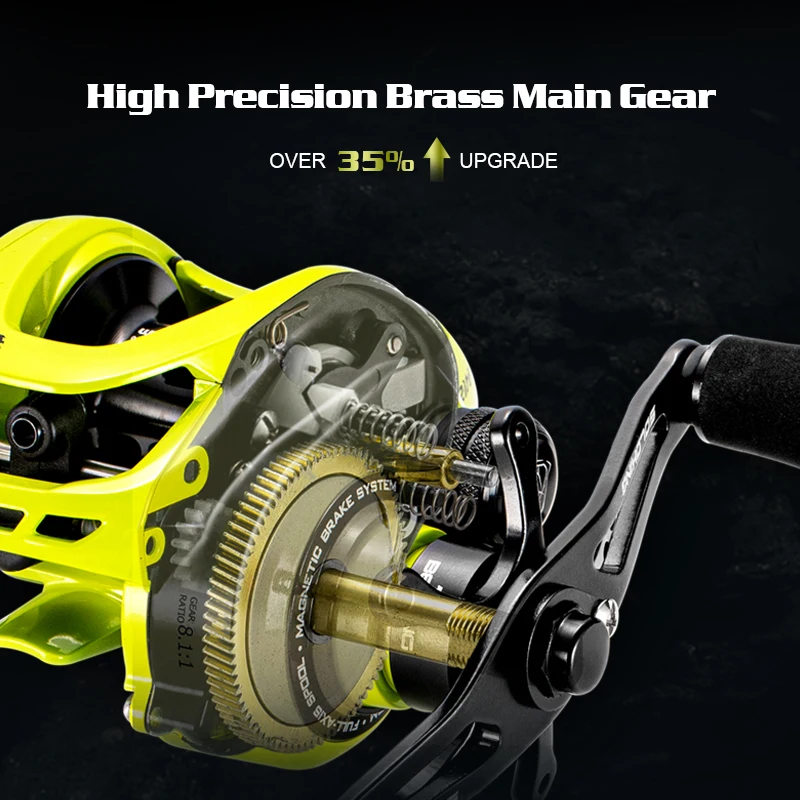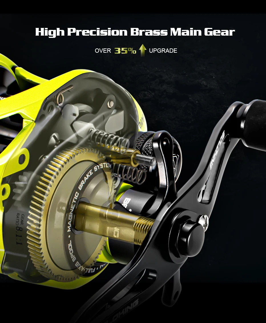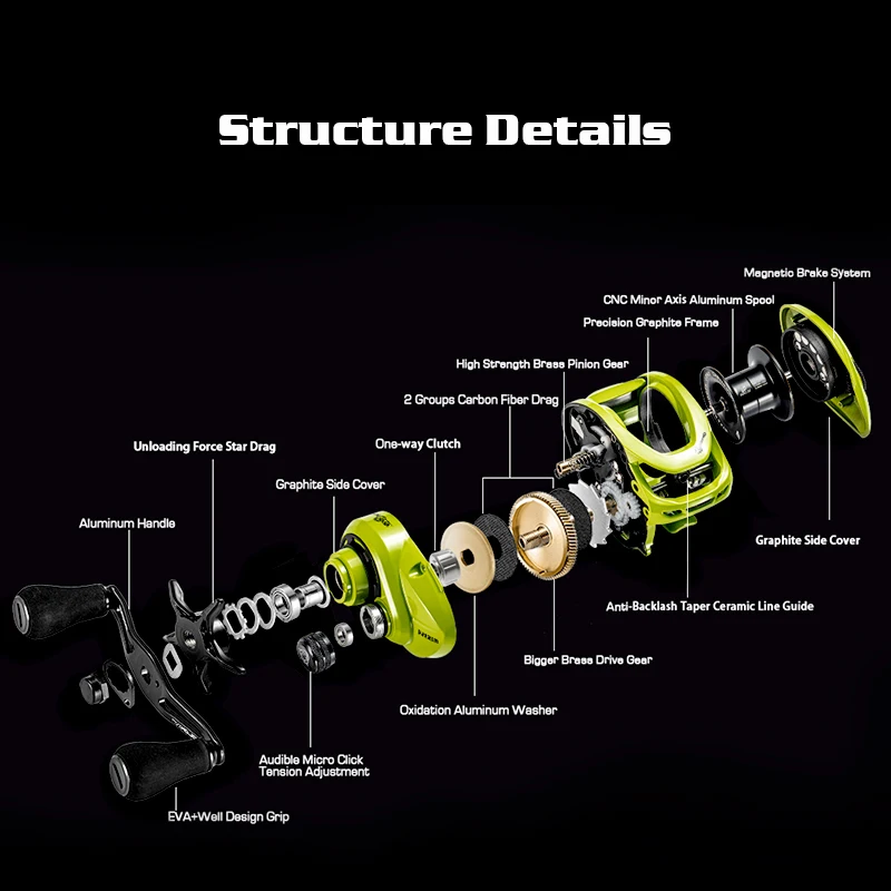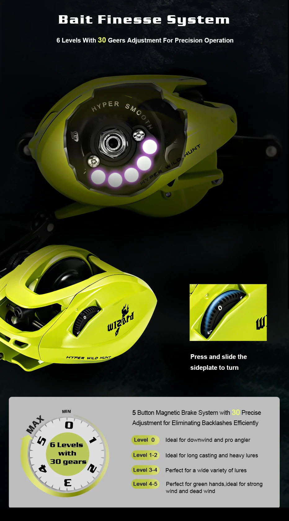 5 кнопочных магнитных тормозных систем с 30 точностью регулировки для устранения задних ресниц эффективный уровень 0 идеально подходит для нисходящего ветра и pro angler Level 1-2 идеально подходит для длительного литья и тяжелого блесна уровень 3-4 идеально подходит для a широкий выбор приманки уровень 4-5 идеально подходит для новых рыболовов. Идеально подходит для сильного ветра и мертвого ветра.