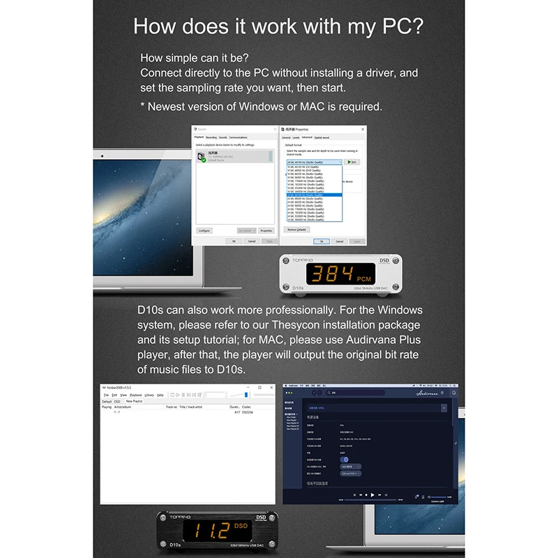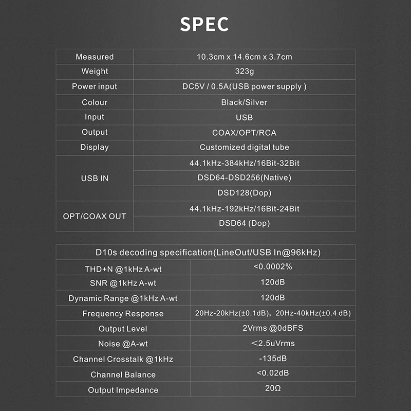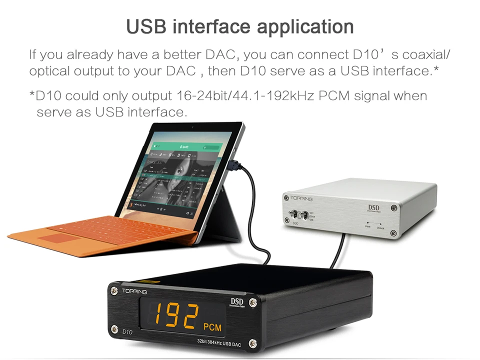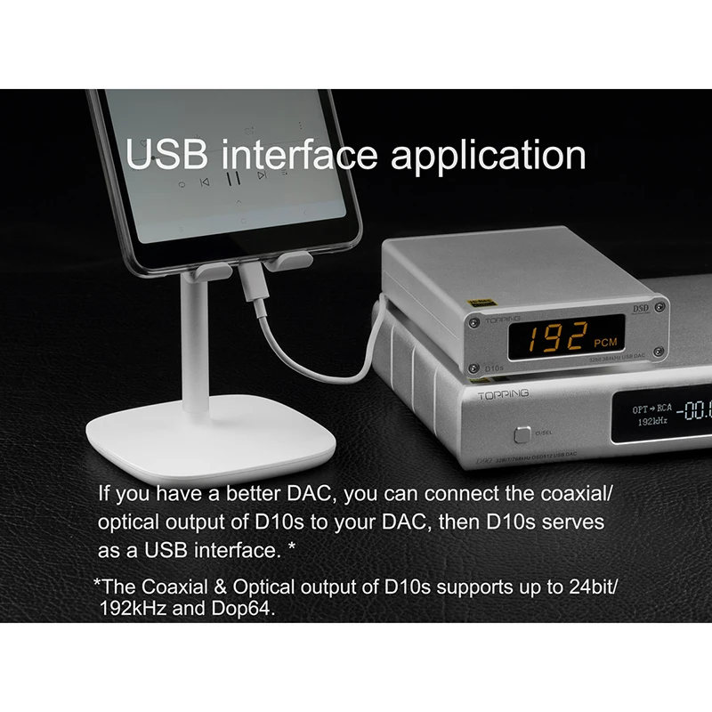 TOPPING D10-это usb-dac с линейным выходом, оптическим и коаксиальным выходом. Он использует XMOS(XU208) + ES9018K2M + OPA2134 и настроенный драйвер Thesycon (Windows) для поддержки максимального PCM384kHz/32bit и DSD256(Native) Декодирует и отображает формат и частоту выборки по Индикатору. D10 также обеспечивает socket OP, чтобы сделать DIYers более легко изменить другой OP, чтобы получить различный звуковой эффект. D10 совместим с Android, Windows(7 или выше), MAC и D10 могут автоматически включать/выключать синхронизацию с компьютером. D10 имеет Hi-Res аудио, CE, ROHS и FCC сертификат.