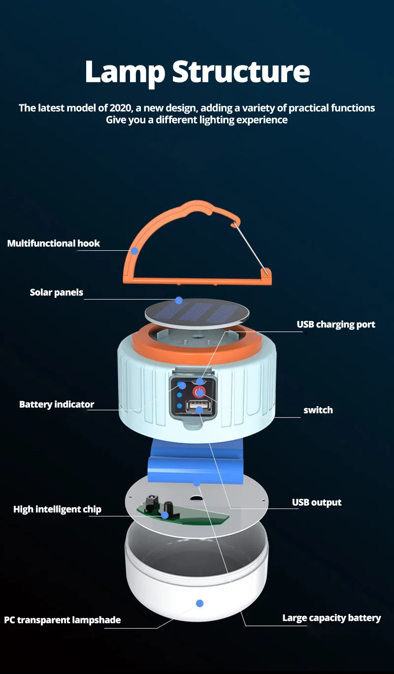 Widely Used: A must-have lamp for home improvement and outdoor activity with 60W/190/240W and USB/Solar charging hanging LED light! Let it be your yard/garden/patio/porch/garden/barbecue or street stall bussiness and upgrade your outdoor atmosphere. Three Modes: This premium solar rechargeable LED light bulb will adjust its brightness to your specific needs with 3 different lighting modes. Choose from High Light, Low Light, SOS Light to meet you whenever and wherever. Power Display & Remote Control: There are 25%/50%/75%/100% four-speed remaining battery indicator lights, reminding you to charge at any time. Remote control switch and light mode, very convenient and practical. Energy Saving: It is a 1200/6400mAH battery-operated lamp from sturdy ABS, providing you with uniform light through constant current due to its 24/42pcs x 5730 LED lamp beads. Direct-charged within 8-10h, it offers amazing light for 8-16 hours. Solar charging, zero electricity bill,thats awsome! Easily Carried: Easily portable, this solar chargeable LED light lantern will follow you with no more having to bring batteries everywhere is a huge relief!
