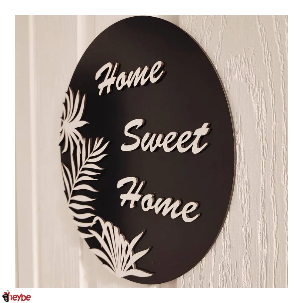 Этот товар с цветочным узором и надписью Home Sweet Home сделан в технике тиснения белого дерева на черном деревянном фоне.