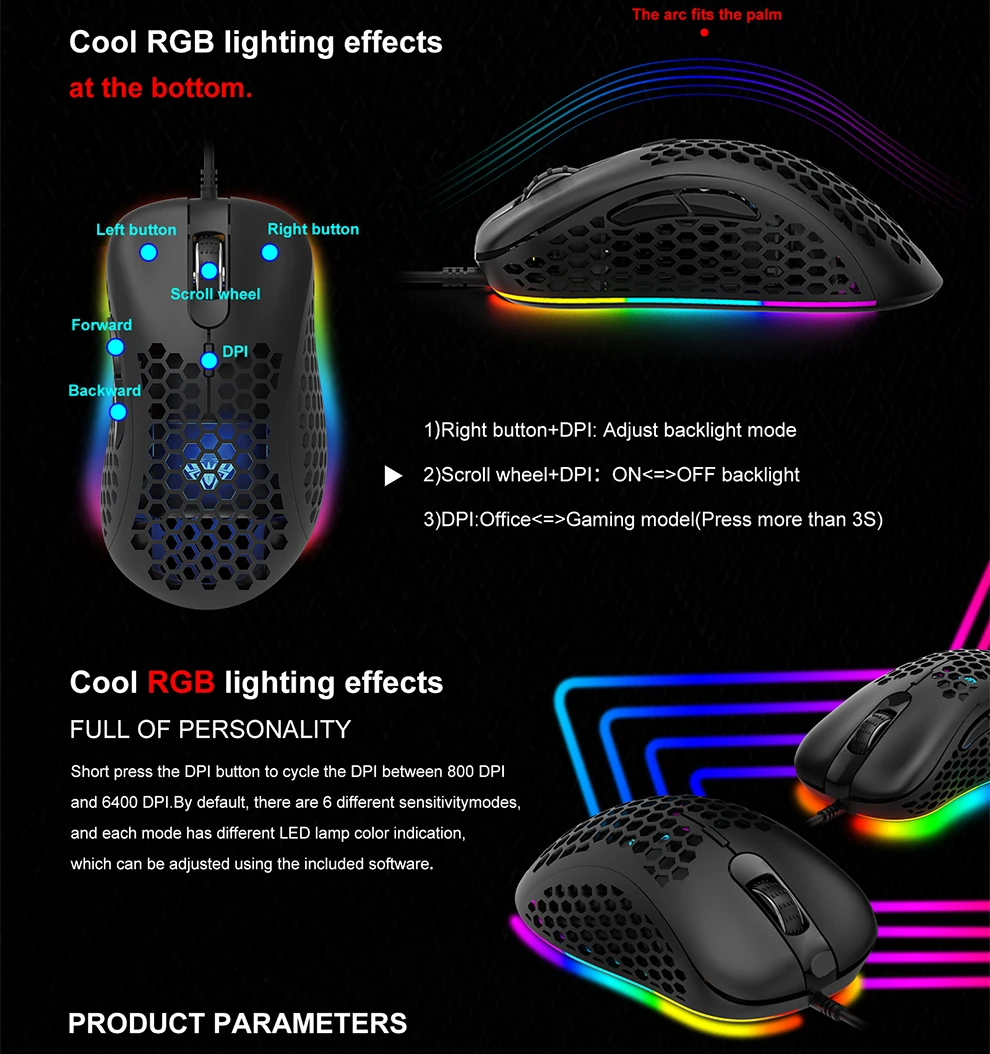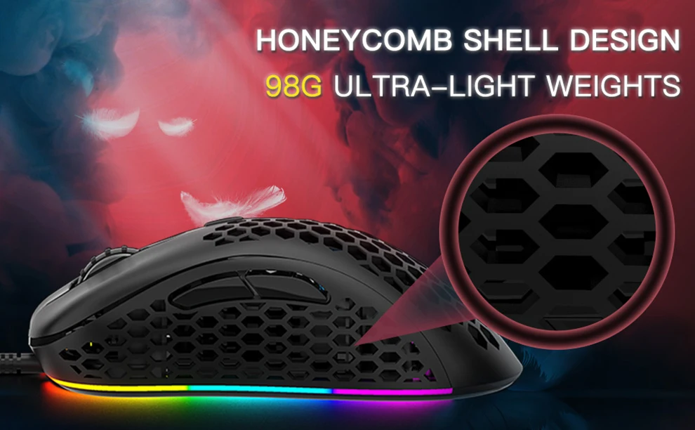 Эта игровая мышь 98g Очень легкая и использует новую сотовую перфорированную оболочку, которая более благоприятна для уменьшения потоотделения ладони. Ультра-светильник-мышь также использует эргономичный дизайн, подходит для правой руки, удобно держать, может помочь снять усталость после длительного использования.