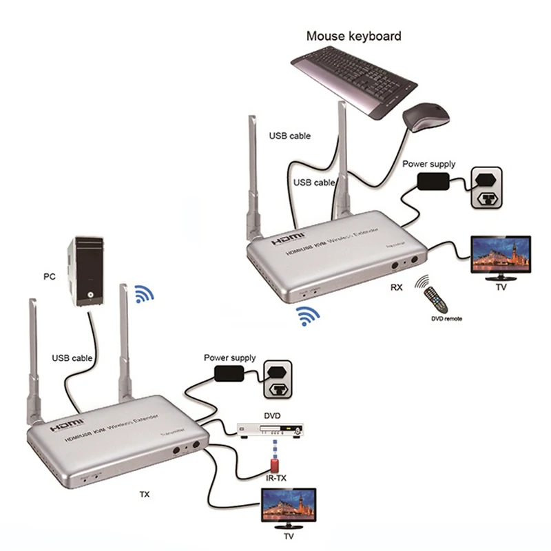 Этот беспроводной удлинитель HDMI/KVM uses2.4G and5G обеспечивает высокоскоростную, высокопроизводительную беспроводную связь между бытовой электроникой, компьютером и мобильными устройствами. Он сочетает в себе высокую пропускную способность с strongerror-коррекцией, чтобы доставить несжатое HD видео. Он может проходить через стену и передавать сигнал до 50 м на открытой местности.