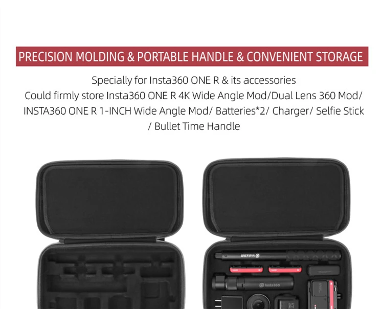 Может хранить Insta360 ONE R 4K широкоугольный мод/двойной объектив 360 мод/INSTA360 ONE R 1-INCH широкоугольный мод/2 шт батареи/зарядное устройство/селфи палка/ручка пули времени/Монтажный кронштейн/Пряжка замка/Накатанные винты для большого пальца/USB-C кабели для передачи данных/руководство пользователя, И так далее