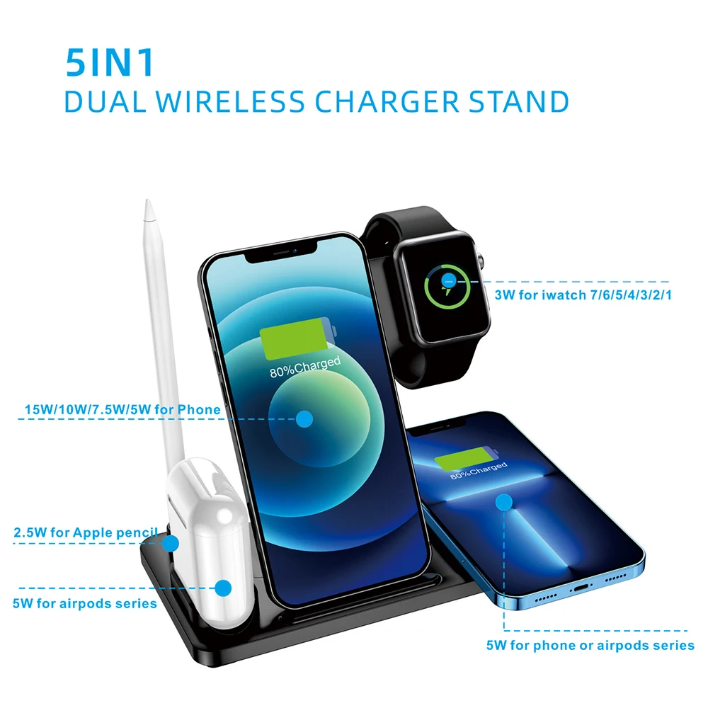 Универсальный держатель подставки для зарядного устройства, Настольная Подставка для зарядки, 30 градусов, эргономичный дизайн, позволяет пользователям заряжать мобильный телефон. Беспроводная зарядная панель поддерживает зарядку для iWatch, iPhone и Airpods одновременно и в одном месте. Опыт 5 в 1 беспроводной зарядной док-станции выглядит компактно и элегантно, идеально украшает вашу спальню, офисный стол. Это Беспроводное зарядное устройство может заряжать четыре устройства одновременно, что удобно для вашей жизни.