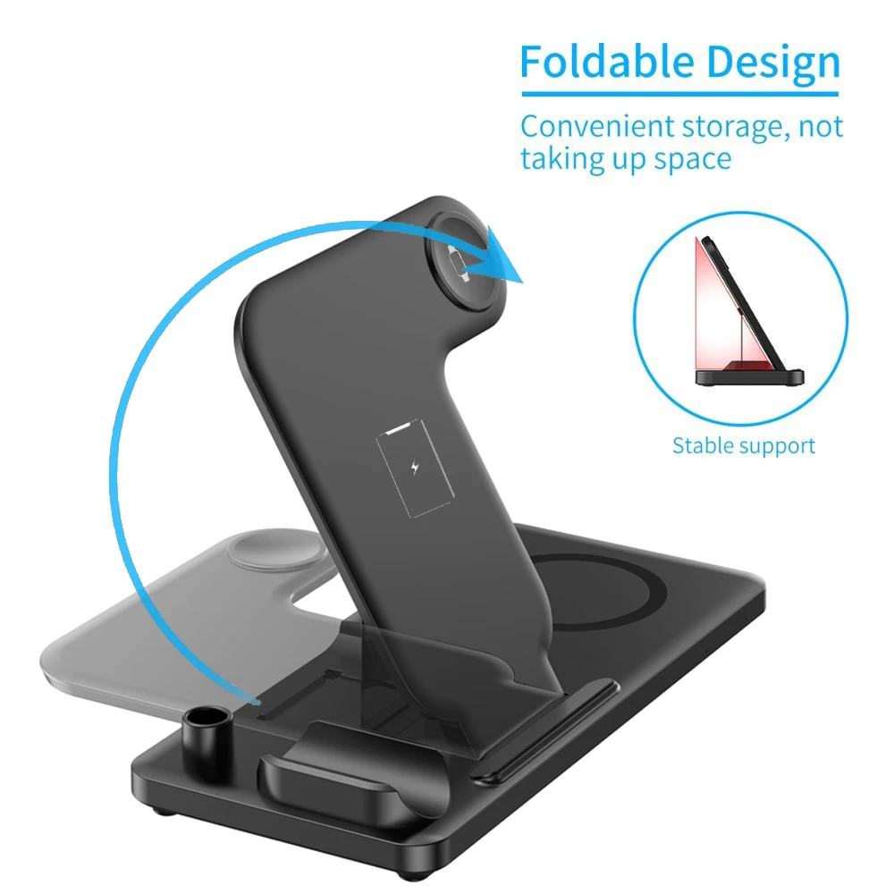 [Складная & Портативный] поручая станцию стыковки толщиной менее 0,6 дюйма в сложенном состоянии, просто занимает мало spaceis. Держатель зарядного устройства в сложенном виде также может регулировать металлический кронштейн, чтобы поддерживать удобный угол, который вы хотите. Горизонтальный и вертикальный экран также может работать с зарядным устройством. Только один кабель для зарядки всех ваших iPhone Apple Watch Airpods, чтобы сделать ваш рабочий стол и тумбочку более аккуратными. Это Беспроводное зарядное устройство может заряжать четыре устройства одновременно, что удобно для вашей жизни.