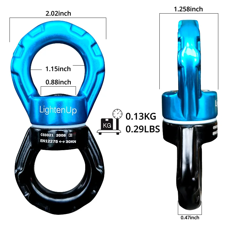 Прочность на разрыв: 30 кН (3000 кг). Это делает силу более гладкой и равномерной при подвешивании. Внутри вращающегося соединителя имеются подшипники, которые эффективно предотвращают скручивание и завязывание веревки. Он легкий и удобный для переноски, обеспечивает удобство для вашей поездки на скалолазание, качелях для йоги, качелях гамака и других видов деятельности в помещении или на открытом воздухе.