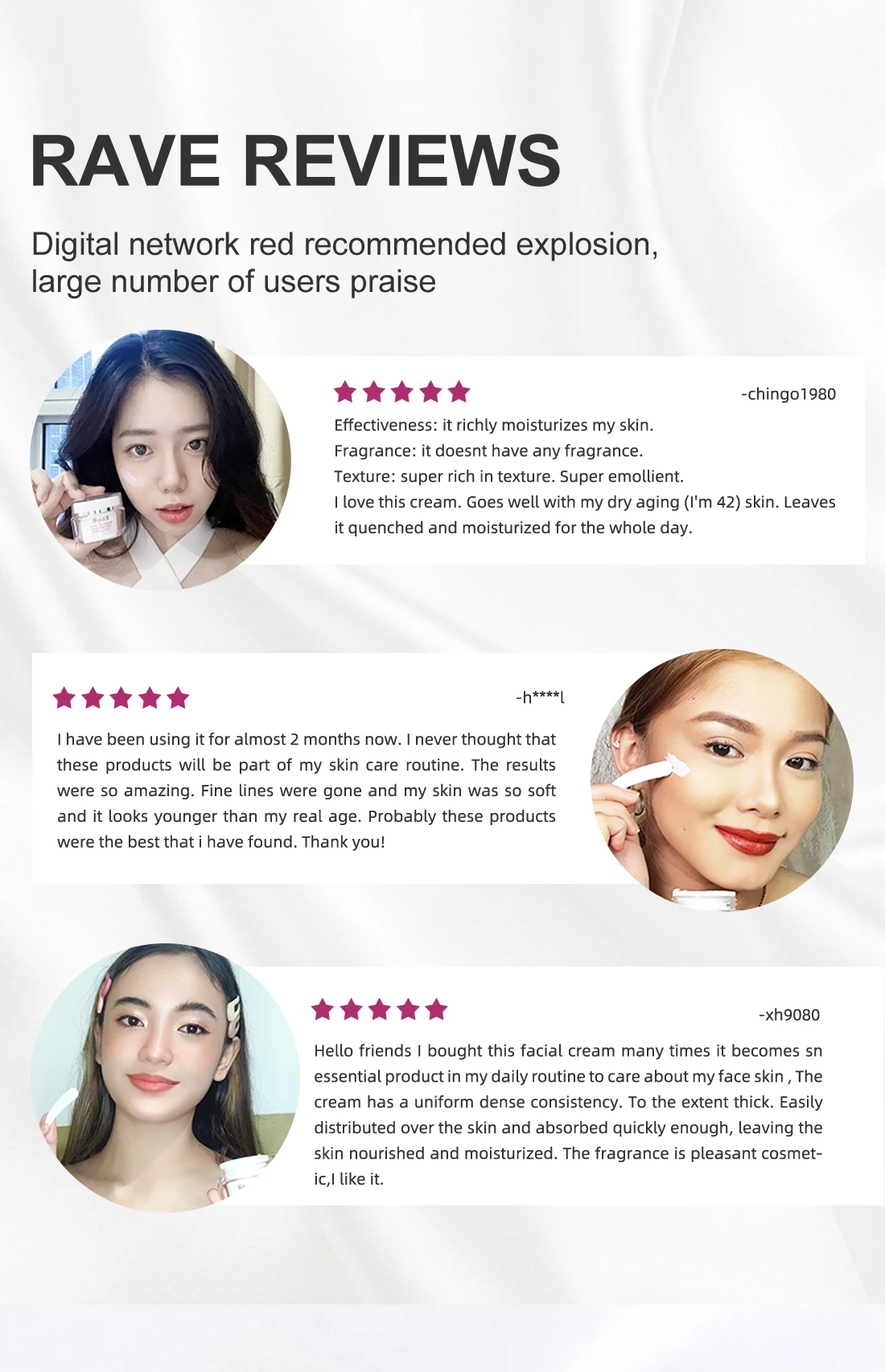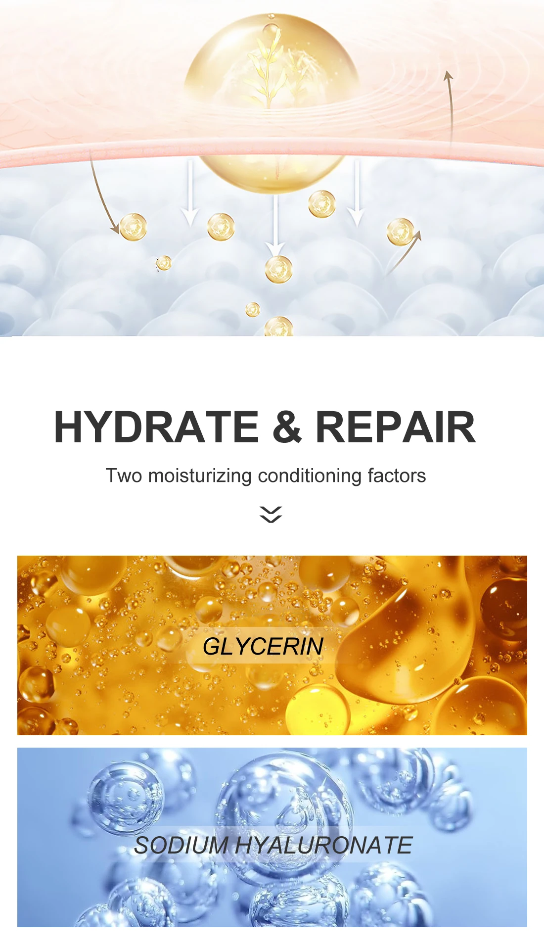 Гладкое Шелковистое прикосновение, легкое поглощение, проникновение питательного, бережного ухода, также может образовывать слой водной пленки на поверхности кожи, пополнять воду и блокировать воду для кожи, успокаивает сухие и грубые проблемы кожи, вызванные погодными условиями, делает кожу увлажненной и наполненной в любое время.