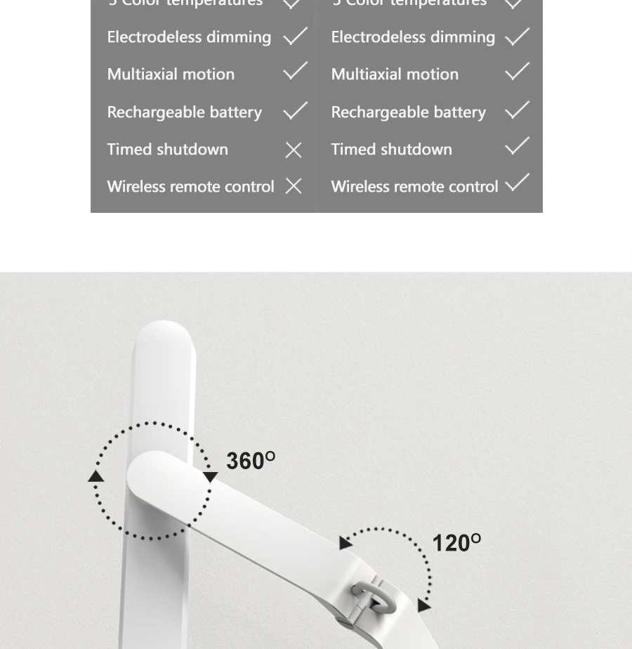 1. Вращение на 360 градусов: два вращающихся вала (120 градусов) складываются, а один универсальный вал вращается на 360 градусов, чтобы соответствовать регулировке направления освещения и удобной работе.