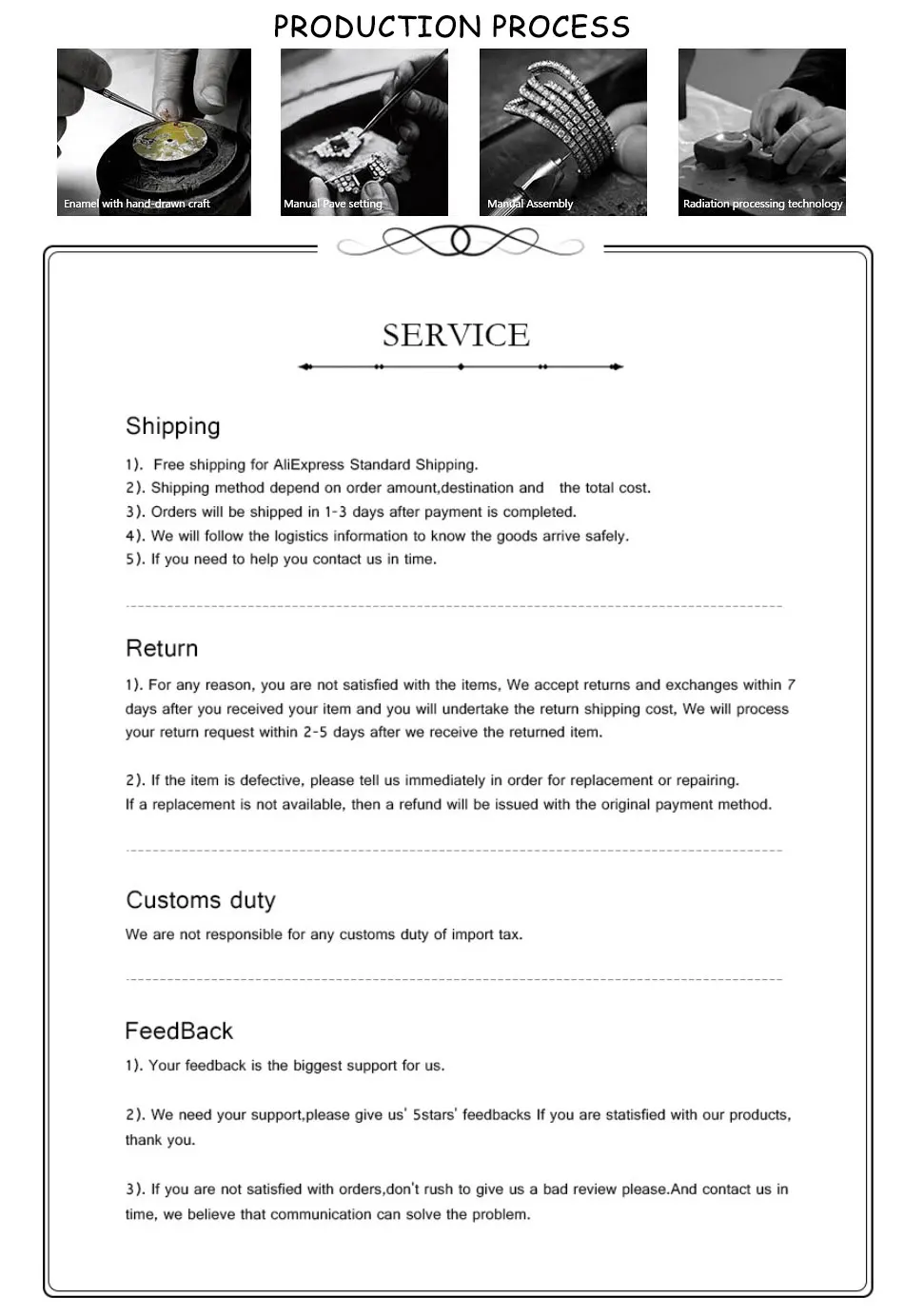 После полной оплаты товар будет отправлен в течение 2-3 рабочих дней. Если вы не можете получить ваш товар вовремя, пожалуйста, свяжитесь с нами, мы проверим и решим его для вас как можно скорее. Мы ответим на ваш адрес электронной почты в течение 24 часов. Иногда поздно в выходные или праздничные дни. Если вы не можете получить свою электронную почту через 48 часов, пожалуйста, проверьте свой спам или cintact с другим адресом электронной почты. Различные методы доставки требуют разных дней. При заказе вы можете выбрать лучший способ для вас. Мы предлагаем скидки на оптовые заказы и оптовые заказы, и мы можем настроить ваш дизайн для вас. Добро пожаловать, свяжитесь с нами онлайн. Для получения дополнительной информации, пожалуйста, нажмите на бедро. Мы предоставляем услуги прямой доставки клиентам по всему миру. Обычно в посылка отсутствует счет-фактура и информация о бренде, если вам нужна сумка вашего бренда, пожалуйста, свяжитесь с нами. У нас всегда отличные традиционные навыки и идеальное современное высокотехнологичное сочетание для создания самых классических ювелирных изделий. Для того, чтобы создать бренд Dali и улучшить его понимание, мы тщательно производим каждое ювелирное изделие. Очень важны отзывы с пятью звездами. Нам нужно больше покупателей, чтобы оставить пять звезд и поделиться своим опытом покупки в нашем магазине. Когда вы получите посылка, и все в порядке, мы хотели бы, чтобы вы дали нам несколько минут, чтобы оставить комментарий. Если вы можете сделать фотографии своих товаров и Оставить комментарии для нас, это будет очень счастливым выбором. Если есть проблемы с заказом или товаром, пожалуйста, отправьте нам сообщение, чтобы сделать послепродажное обслуживание, прежде чем оставить сообщение.