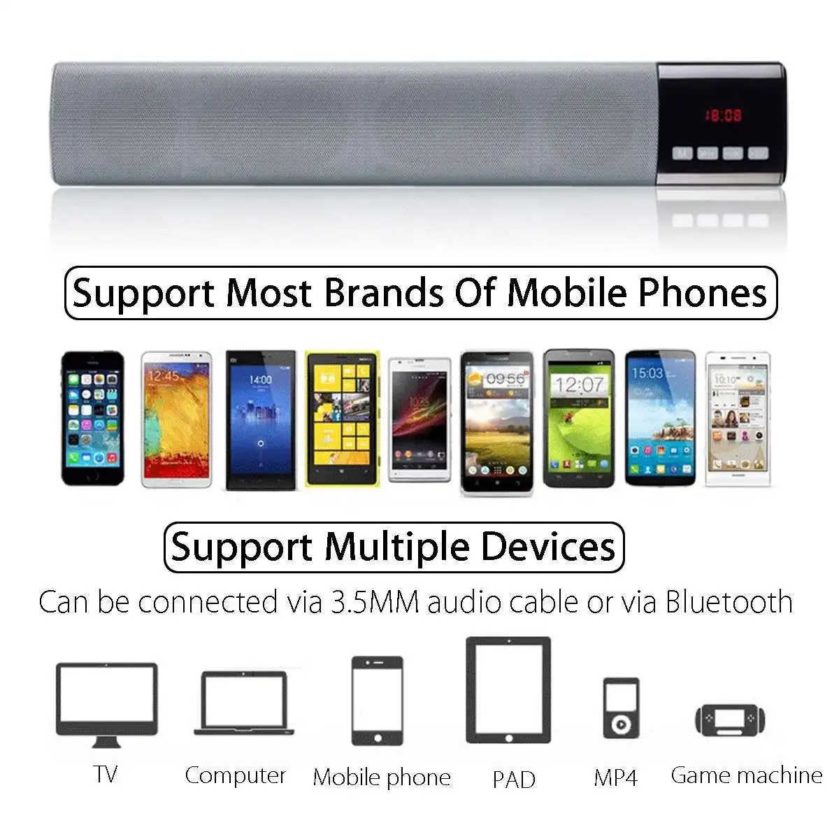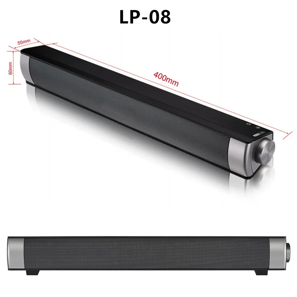 LP-08 характеристики:Версия Bluetooth: 4.0 Выходная мощность: 5 Вт * 2 Емкость аккумулятора: 2000 мАч SNR: ≥ 75 дБ Рабочее напряжение: 5 В постоянного тока размер изделия: 400*55*60 мм Корпус: пластик/сетевой рельс интерфейс: форматы Воспроизведения AUX: MP3 Частотный диапазон: 100 Гц-18 кГц Тип интерфейса: аудиоразъем 3,5 мм расстояние дистанционного управления: 10 м
