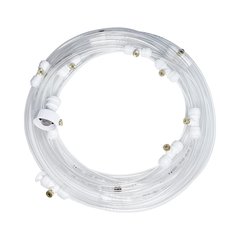 1. Рекомендуется для установки на случай запотевания стекол можно системы на высоте 2,5 м-3 м. 2. Подключите адаптер к воде 3. Включите водопроводный кран, чтобы вымыть систему в течение 1 минуты, чтобы очистить систему и удалить любые примеси. 4. Прикрутите запотевающие насадки к фитингам тройника, за исключением последнего на конце плуга 5. Включите водопроводный кран, чтобы помыть систему в течение 2 минут, чтобы убедиться, что система полностью очищена. 6. Выключите воду и установите последнюю насадку в фитинг с помощью концевого разъема 7. Закрепите линию запотевания с помощью кабельных зажимов. 8. Слегка включите кран, пока струи не будут работать, наслаждайтесь системой охлаждения. 9. Выключайте насадки, держите их сухими и чистыми, когда вы не используете систему запотевания в течение длительного времени