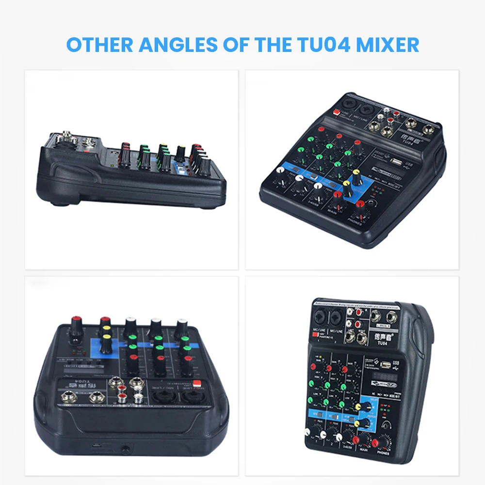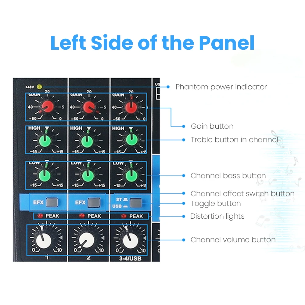 -Микшер оснащен входным усилением и регулировкой высоких басов, встроенным фантомным питанием 48 В для прямого питания конденсаторного микрофона, выходным портом гарнитуры высокой четкости, mp3-трансляцией, устройство со звуковой картой можно напрямую подключить к ПК.
