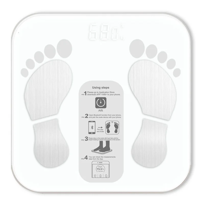 * Платформа из закаленного стекла * Светодиодный дисплей * Максимальный вес: 180 кг * Деление: 100 г * Измерение: вес, жир, вода, мышцы, кость, ИМТ, калории, вязкость и возраст тела * Bluetooth-Совместимость: запись и обмен данными в социальных приложениях, таких как Facebook * Автоматическое включение/выключение * Низкая батарея/индикация перегрузки * Питание: 4 батарейки типа AAA (батарейки не входят в комплект. В любом розничном магазине/супермаркетах очень легко купить батарею типа AAA)