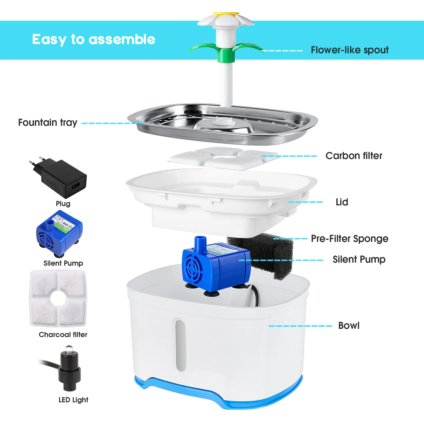 2. Кошачий фонтан оснащен новейшим легким насосом низкого давления, который очень тихий, почти не слышен и не беспокоит вас. Робкая кошка не будет бояться.