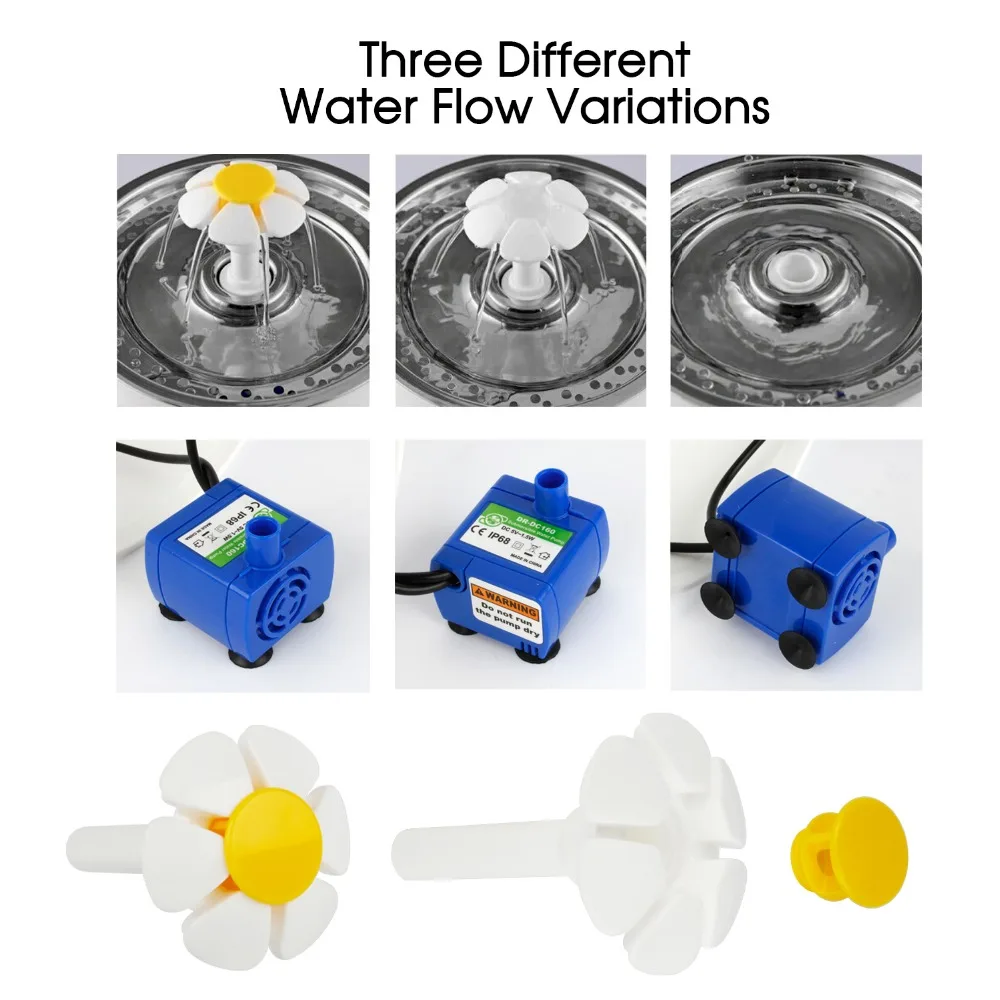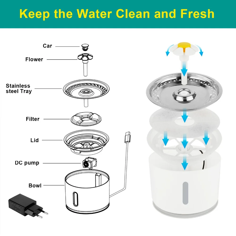 3. Вы можете повернуть крышку цветка или лепестки, чтобы создать 3 различных рисунка потока. Проточная вода наполняет воду воздухом, чтобы повысить уровень кислорода и свежести, поощряя домашних животных пить больше воды и предотвращая болезни мочи и почек.