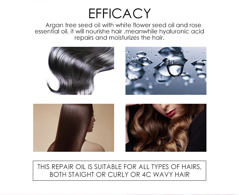 Продукт содержит масло ядра арганового дерева, масло семян цветов белого пруда и эфирное масло дамасской розы, которое может эффективно питать волосы и обеспечивать достаточное количество питательных веществ для волос.