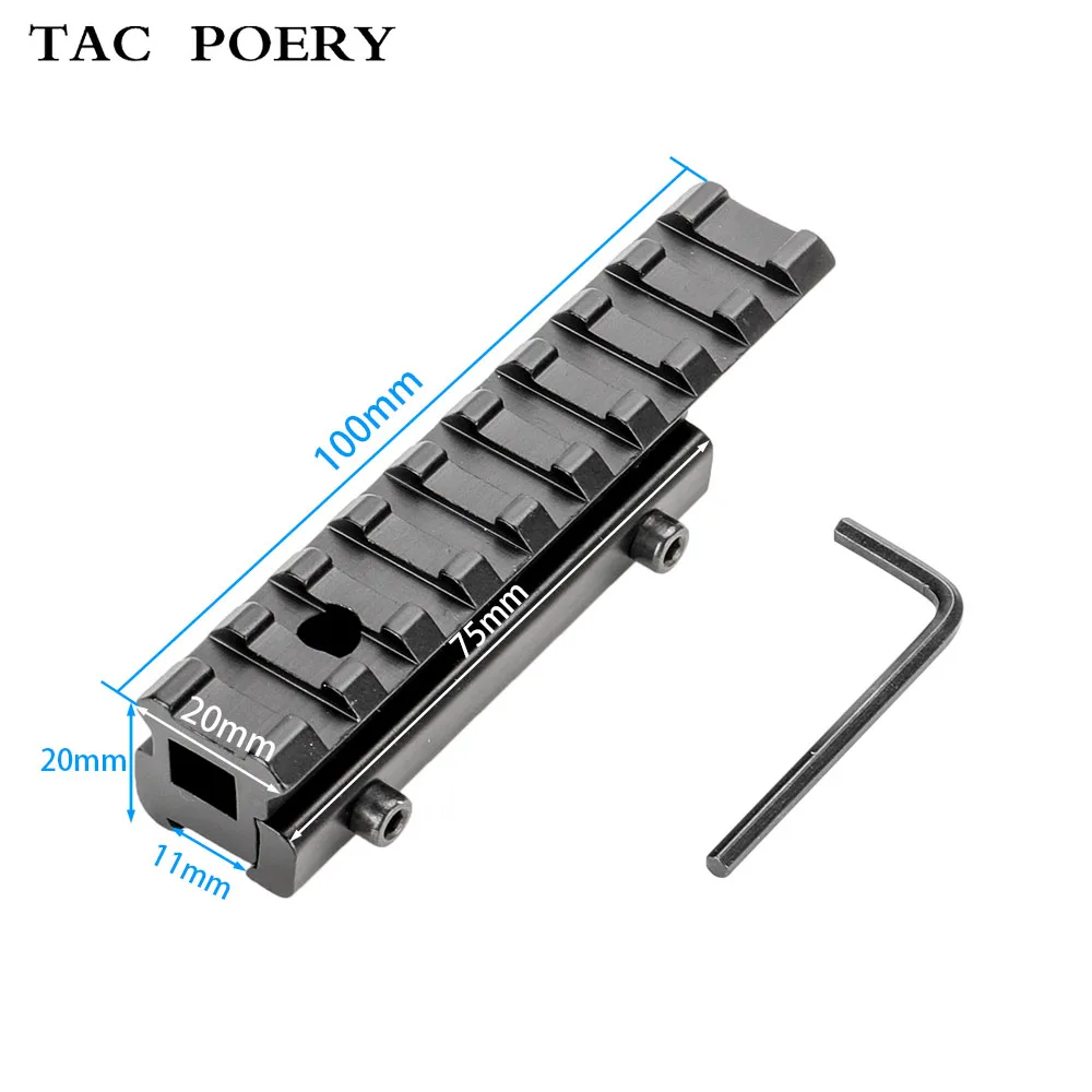 Характеристики:Материал: алюминиевый сплавЦвет: черныйДлина: 100 ммСтояк: 20 ммШирина верхней Пикатинни: 21 ммНижняя ласточкин хвост ширина рейки: 11 ммВес: 77 г