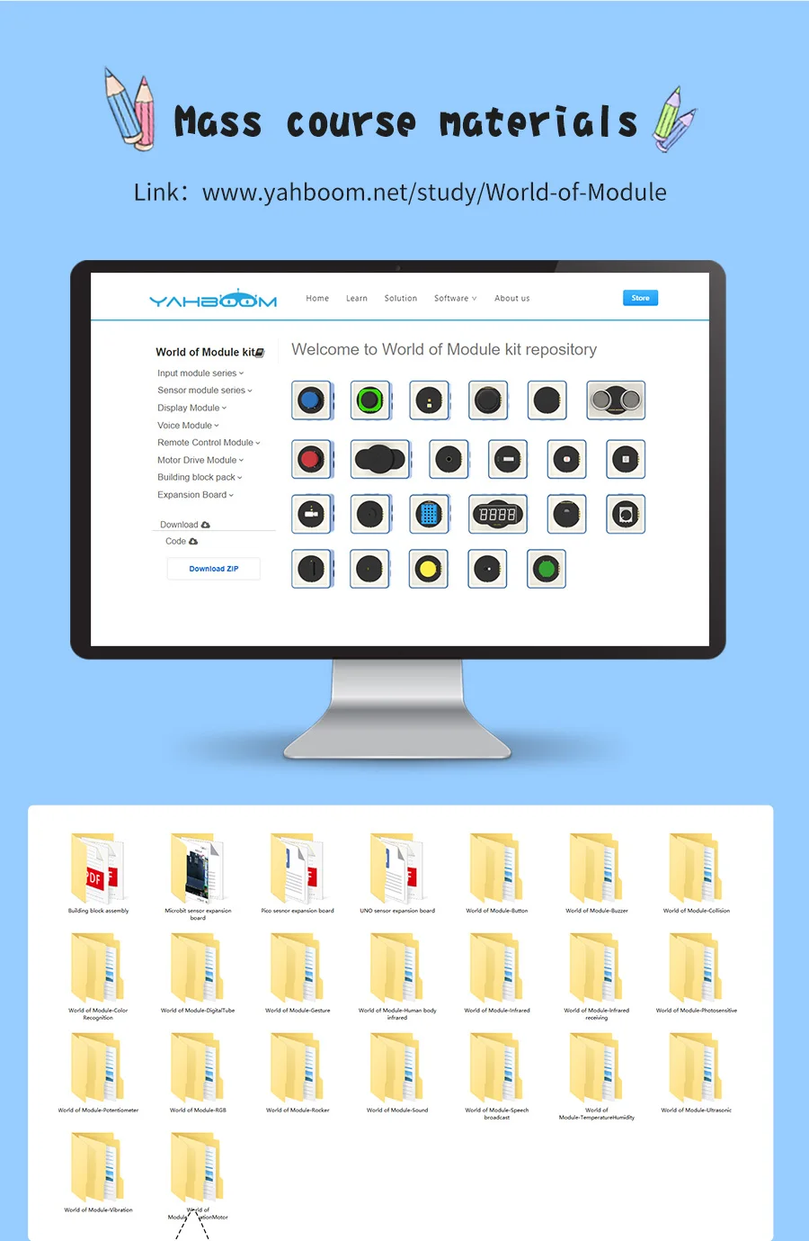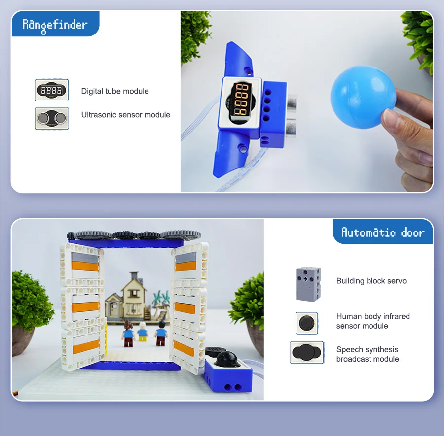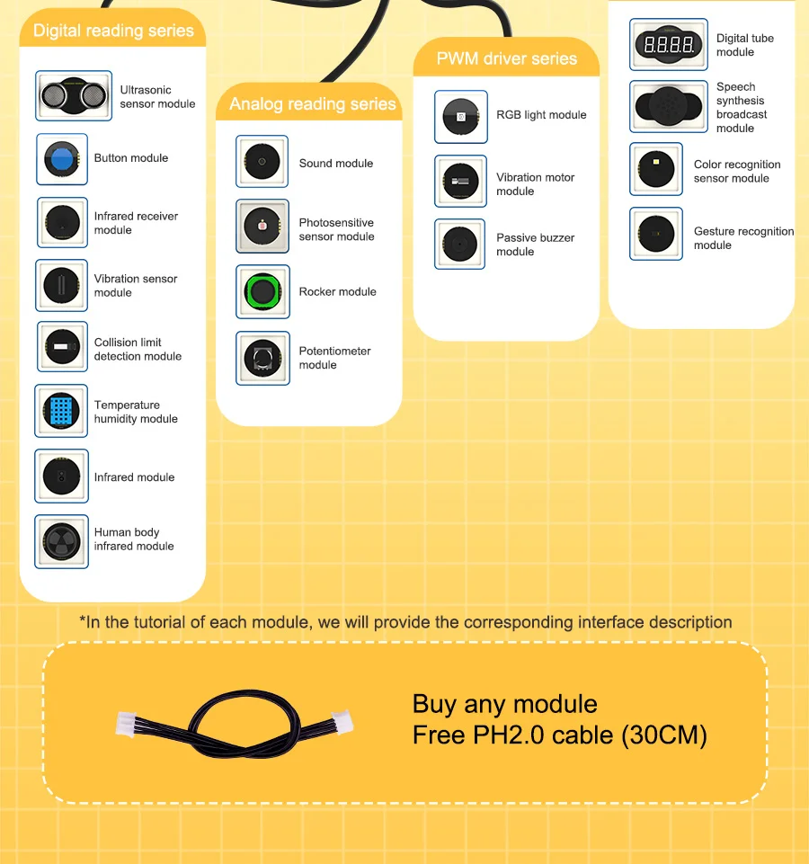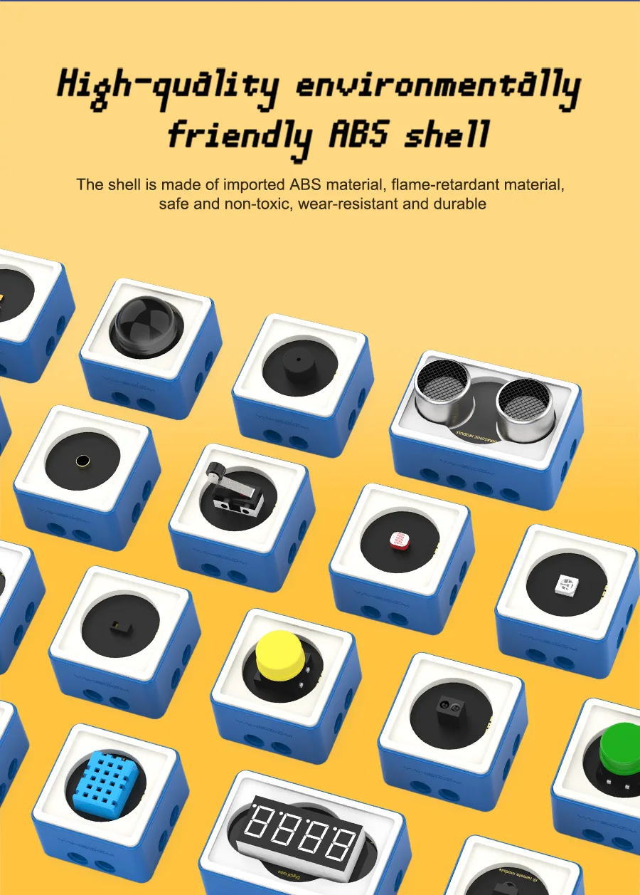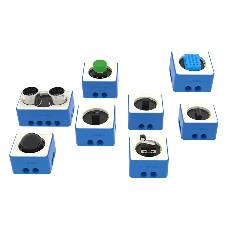 Звуковой модуль, модуль температуры и влажности, ультразвуковой модуль, модуль вибрации, модуль распознавания цветов.