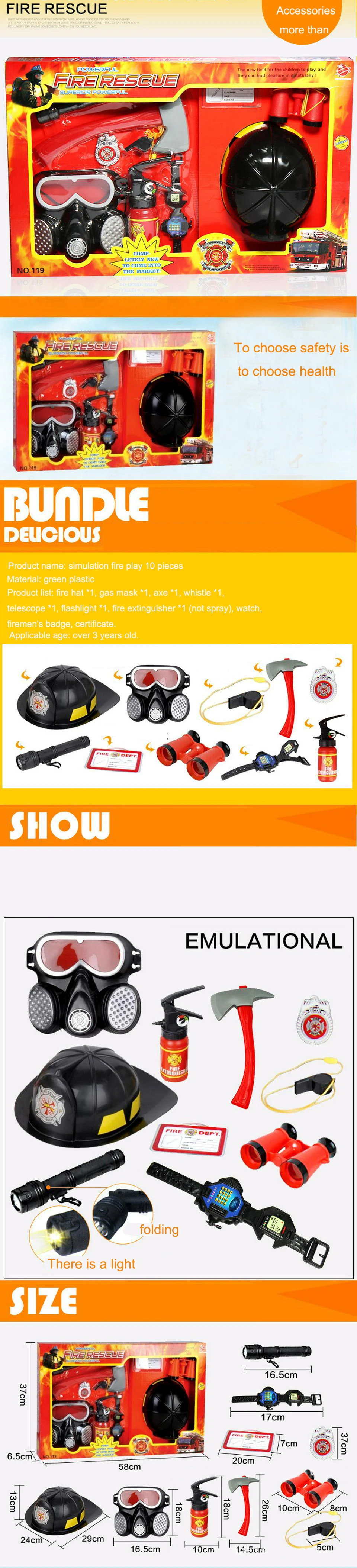 Список продуктов: Огнеупорная шляпа * 1, газовая маска * 1, топор * 1, свисток * 1, телескоп * 1, фонарик * 1, огнетушитель * 1 (не спрей), часы, значок пожарного, сертификат