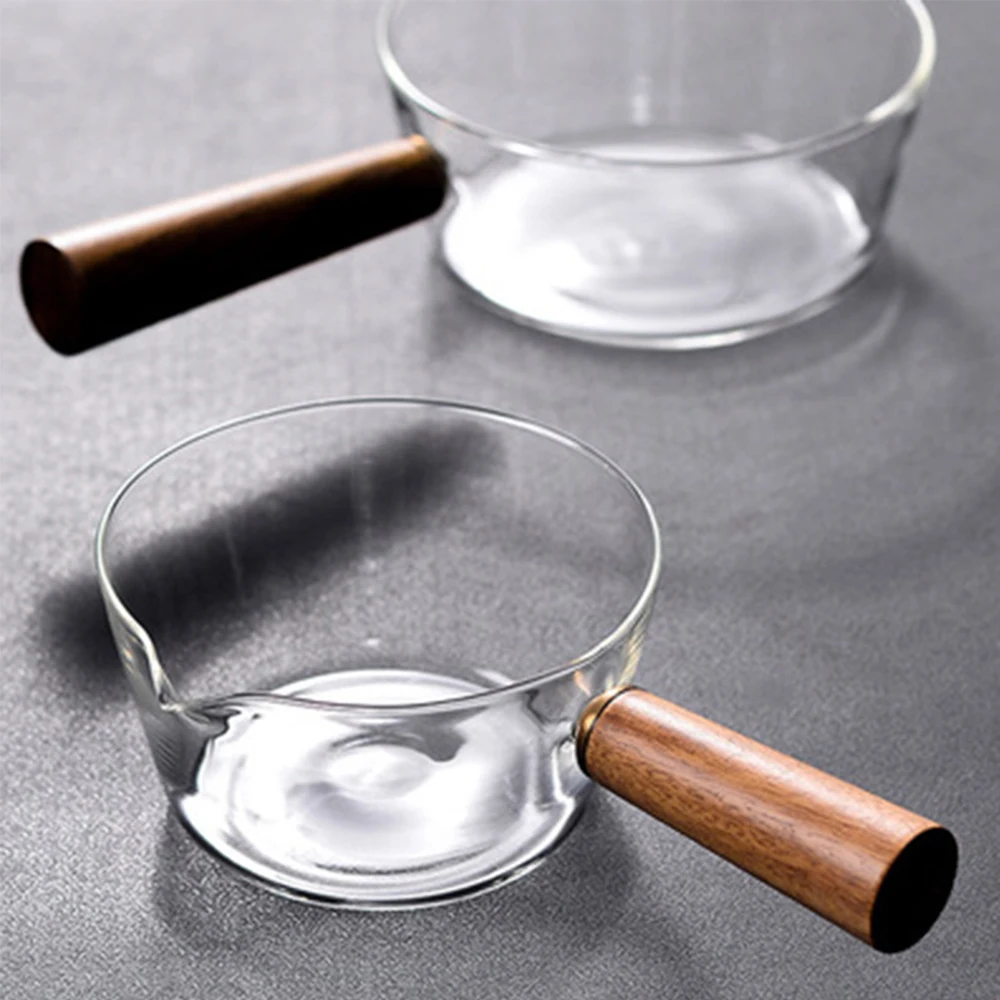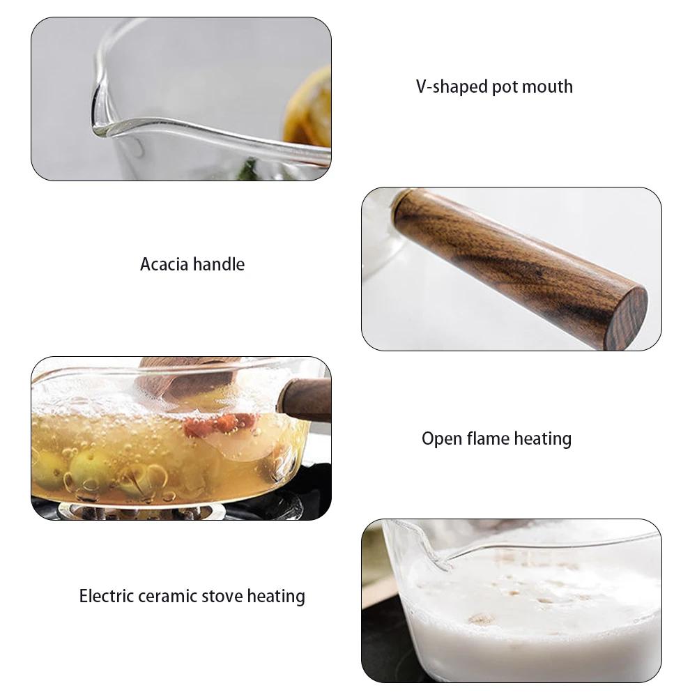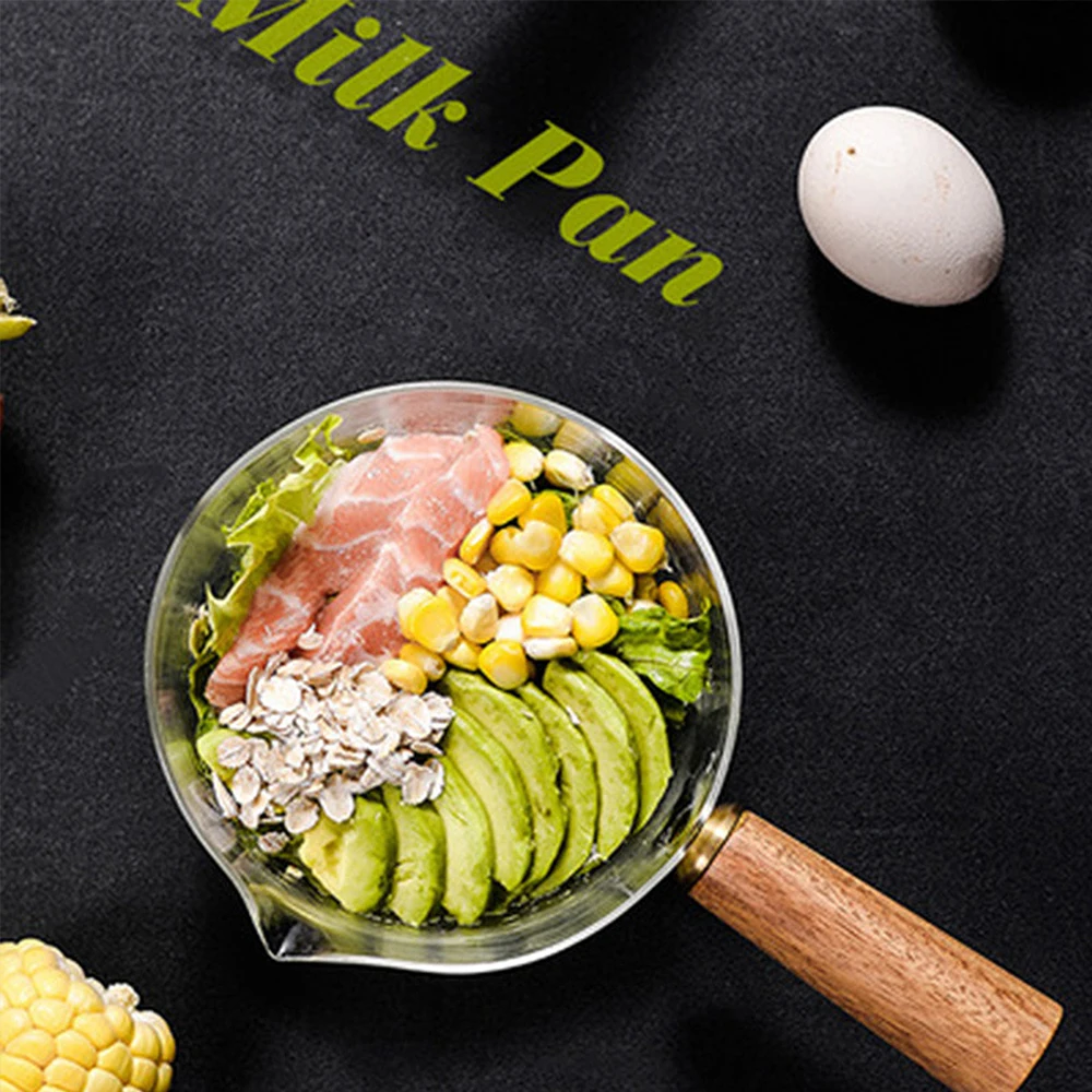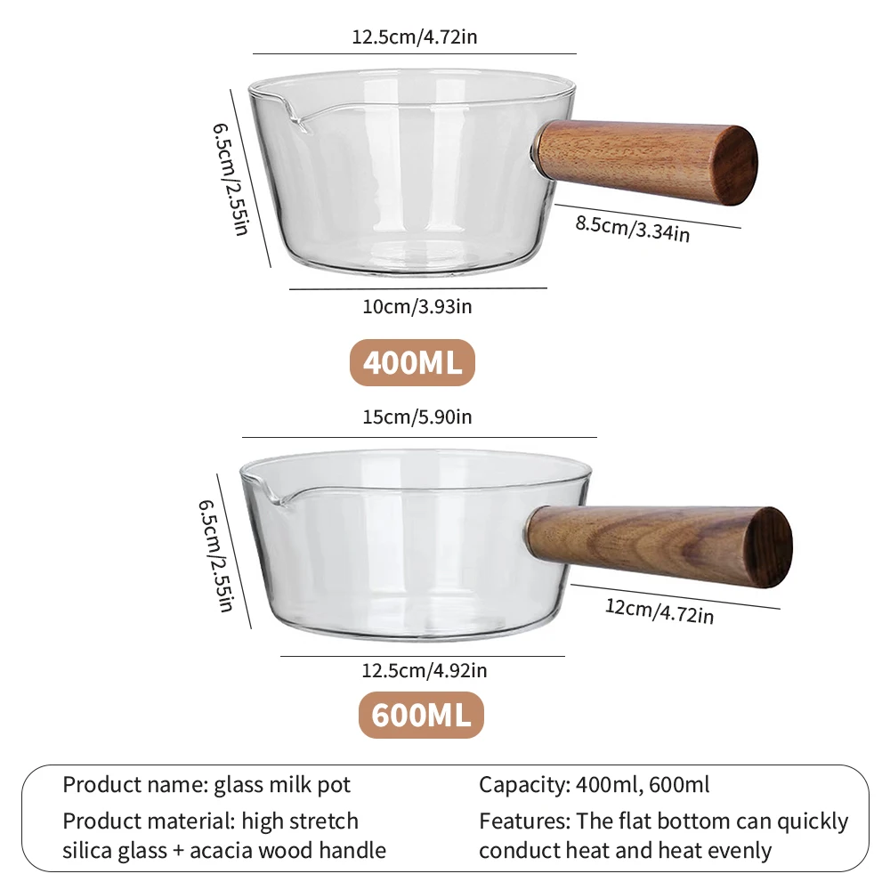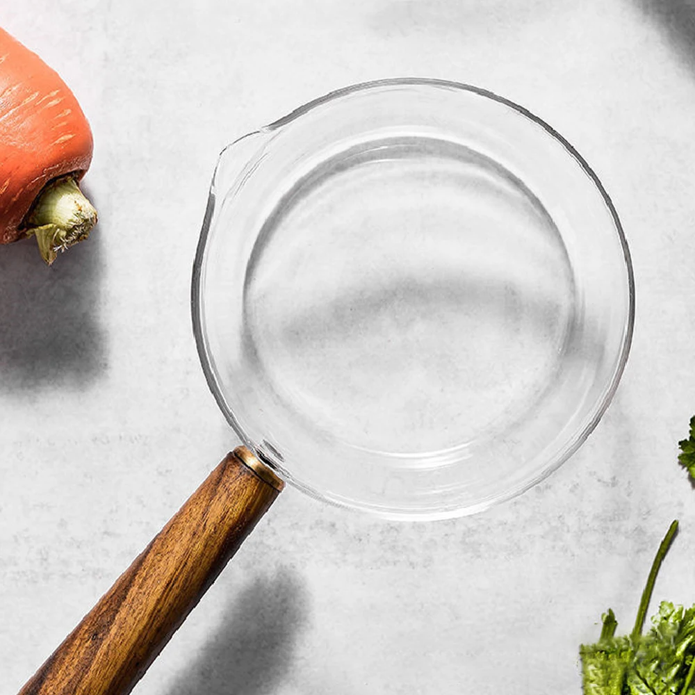 Отзывы о Стеклянная кастрюля для приготовления пищи 400/600 мл молока с деревянной ручкой