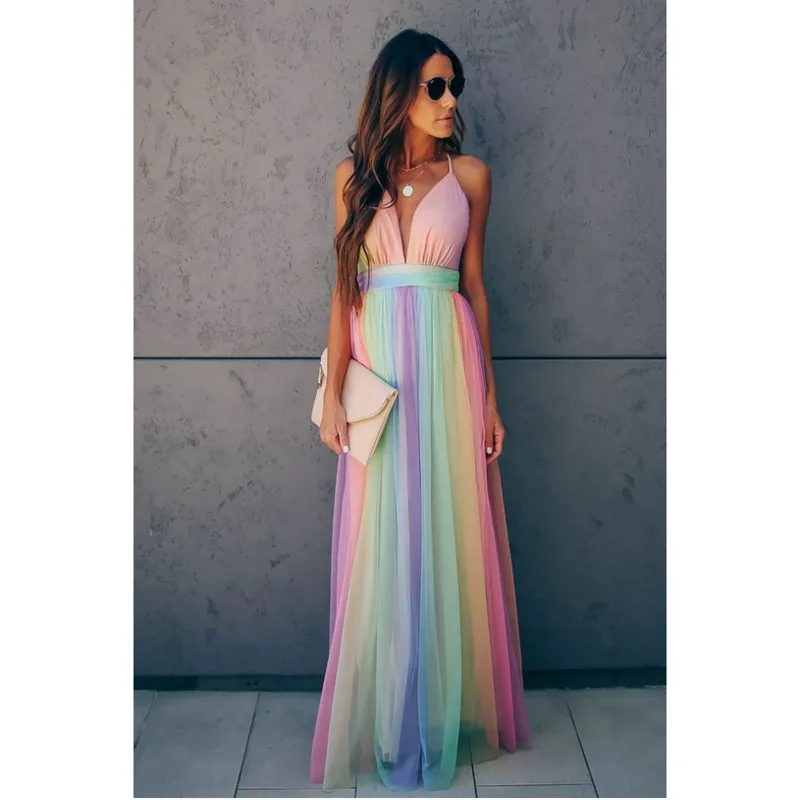 ZA 2021 Новое Женское Элегантное Длинное платье, летнее Сетчатое платье с v-образным вырезом и принтом радуги, без рукавов, кружевное пляжное платье, женские сексуальные вечерние платья