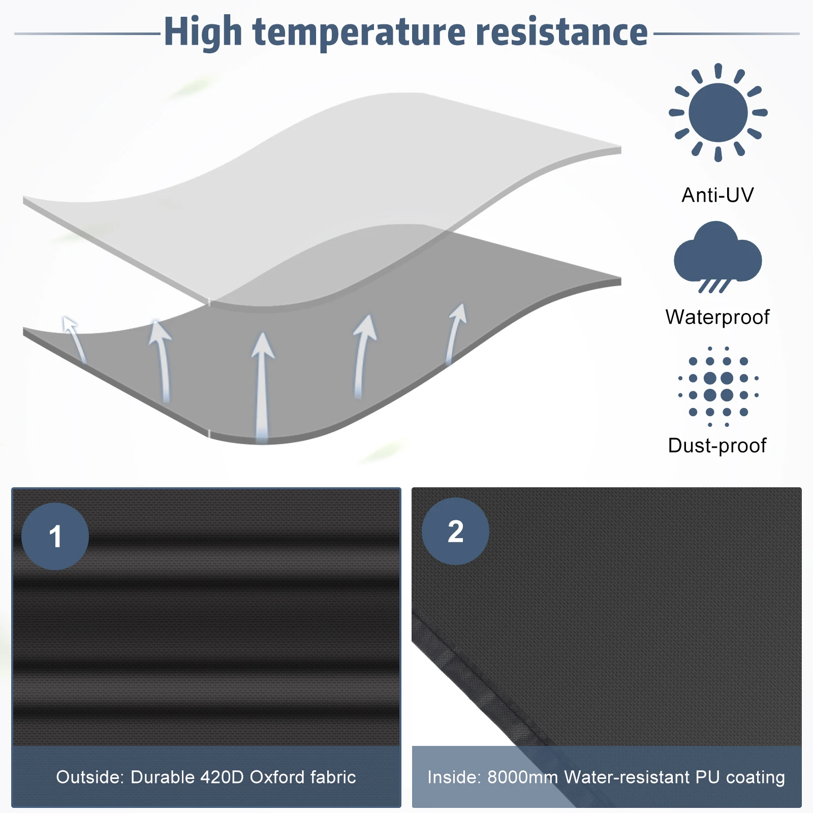1. Этот продукт изготовлен из ткани Оксфорд 420D и полиуретанового покрытия, которое может быть водонепроницаемым, ветрозащитным, устойчивым к ультрафиолетовому излучению и грязеотталкивающим.