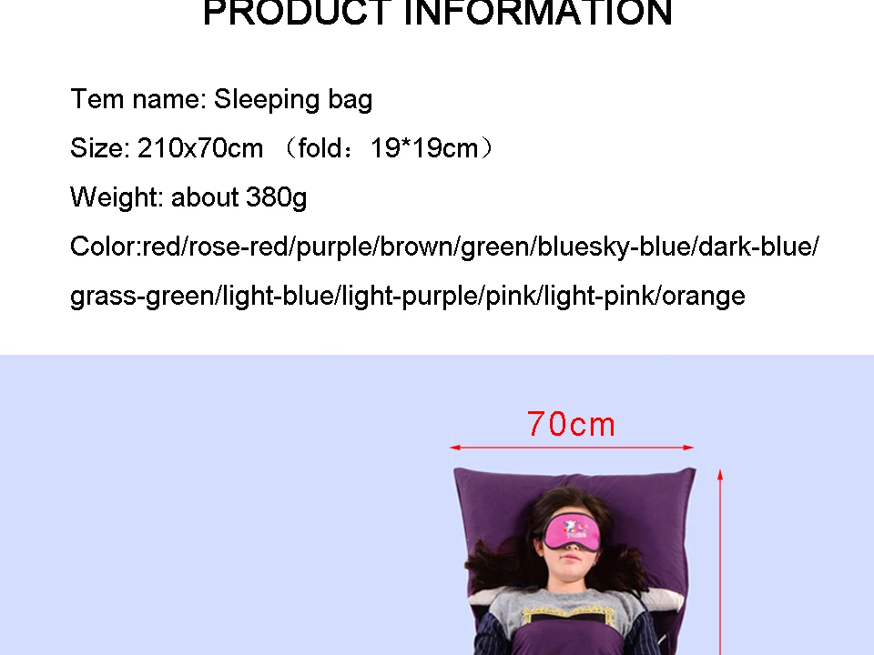 1. Предназначен для путешествий небольшой спальный мешок, карман для вставки подушки, достаточно большой, чтобы двигаться и растягивать ноги