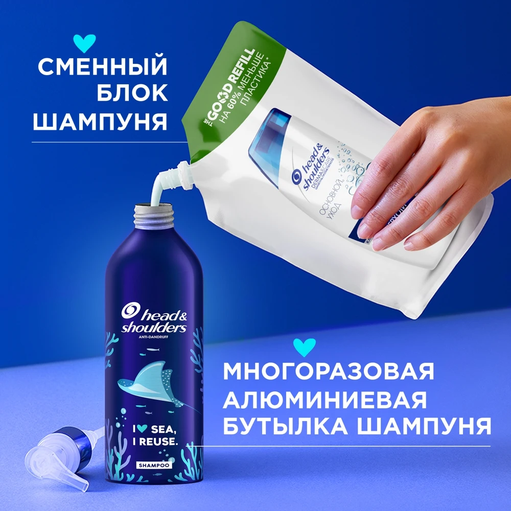 Инновация в уходе за волосами! Теперь шампунь против перхоти Head & Shoulders (Хед энд Шолдерс) Основной Уход производится в стильной алюминиевой бутылке, предназначенной для многоразового использования. Он эффективно очищает и увлажняет кожу головы и волосы, придавая им ощущение свежести. Шампунь содержит активные действующие вещества — пиритион цинка и карбонат цинка — благодаря которым он обеспечивает до 100% свободы от перхоти*. Доказано клинически. 100% перерабатываемая многоразовая алюминиевая упаковка не содержит пластик (за исключением дозатора) и легко пополняется с помощью сменного блока (продается отдельно), когда шампунь закончится. Перейдя на использование многоразовой алюминиевой бутылки и сменного блока, вы поможете уменьшить количество пластиковых отходов на планете. На 100% красивые волосы, на 60% меньше пластика (за мл, по сравнению со стандартной упаковкой бренда). *Видимой перхоти при регулярном применении.