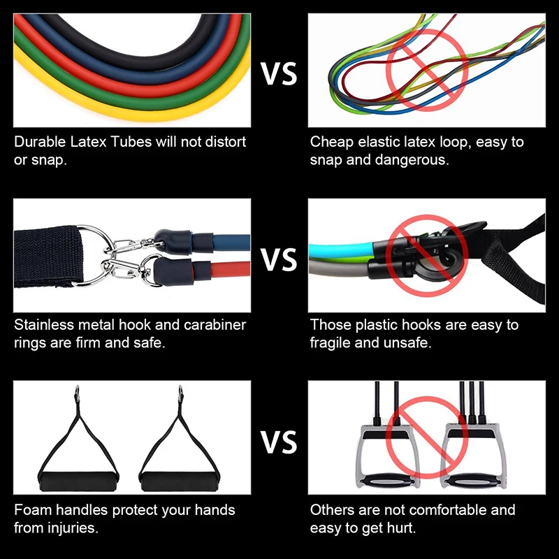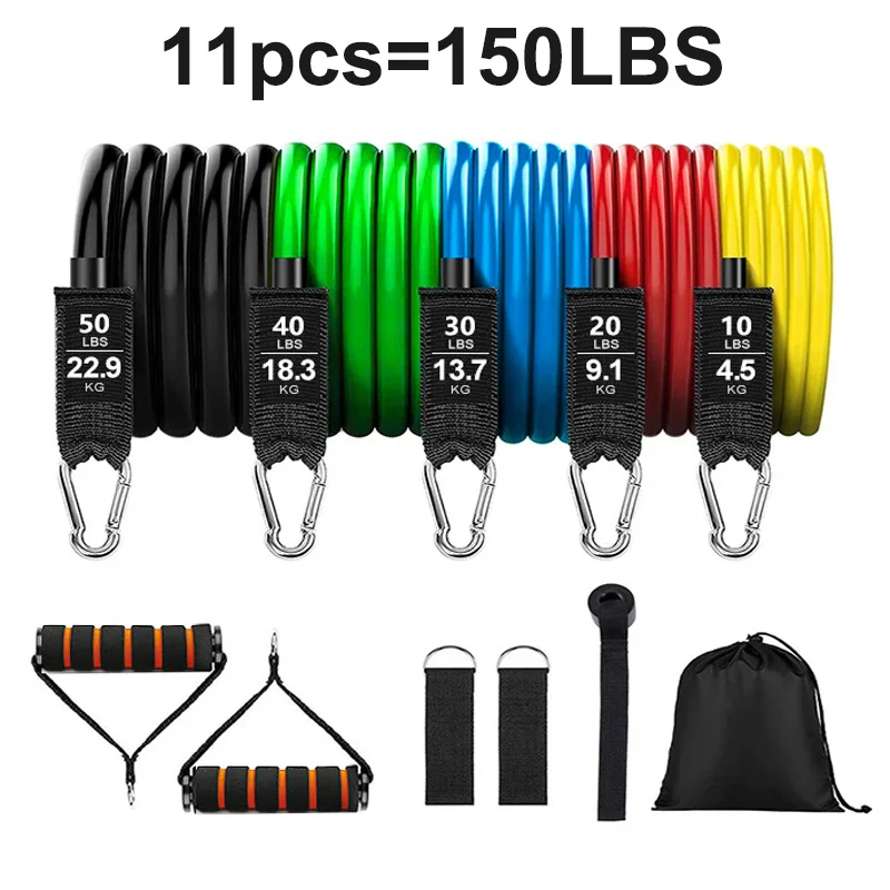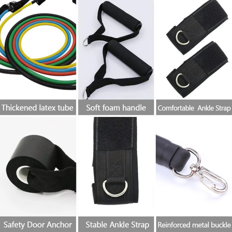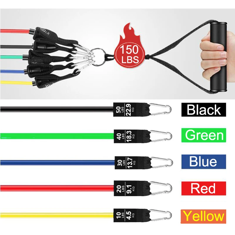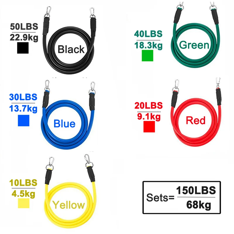 11 шт комплектов 125LBSДлина: 120 смЖелтый ремешок = 15 фунтовКрасный ремешок = 20 фунтовЗеленый ремешок = 25 фунтовСиний ремешок = 30 фунтовЧерный ремешок = 35 фунтов 2 x мягкие ручки1 x дверной безопасный якорь2x ремешки на лодыжке1 нейлоновая сумка для переноски