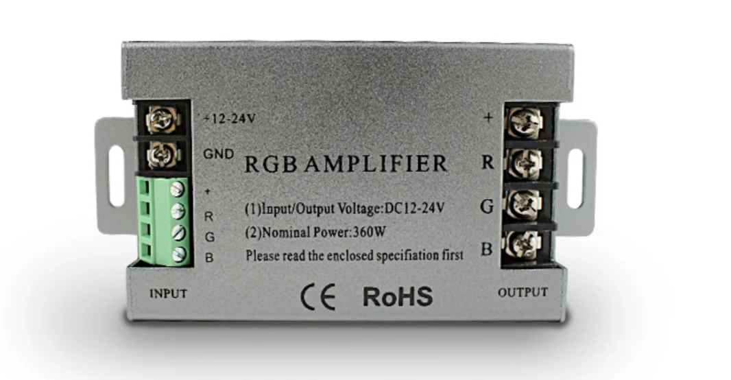 Этот усилитель RGB подходит для всех видов светодиодных контроллеров постоянного напряжения RGB. Он может увеличить светодиодный сигнал контроллера через RGB, чтобы получить ШИМ (модуляция ширины импульса), и выводить сигнал на нагрузку, затем он может сделать тот же эффект с контроллером. В тех случаях, когда добавить каждый дополнительный усилитель, можно подключить и управлять светодиодный в два раза больше светодиодный свет. Теоретически, один контроллер может соединиться с тысячами этого усилителя RGB, И может сделать такой же эффект.