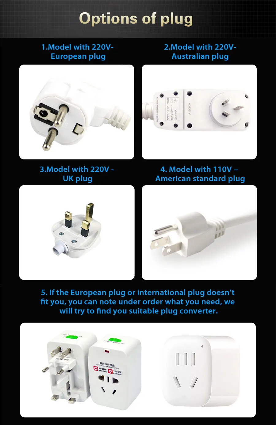 4. Напряжение 220 В и 110 В. Вилки могут быть настроены на вилки ЕС, вилки Австралии и американские вилки.