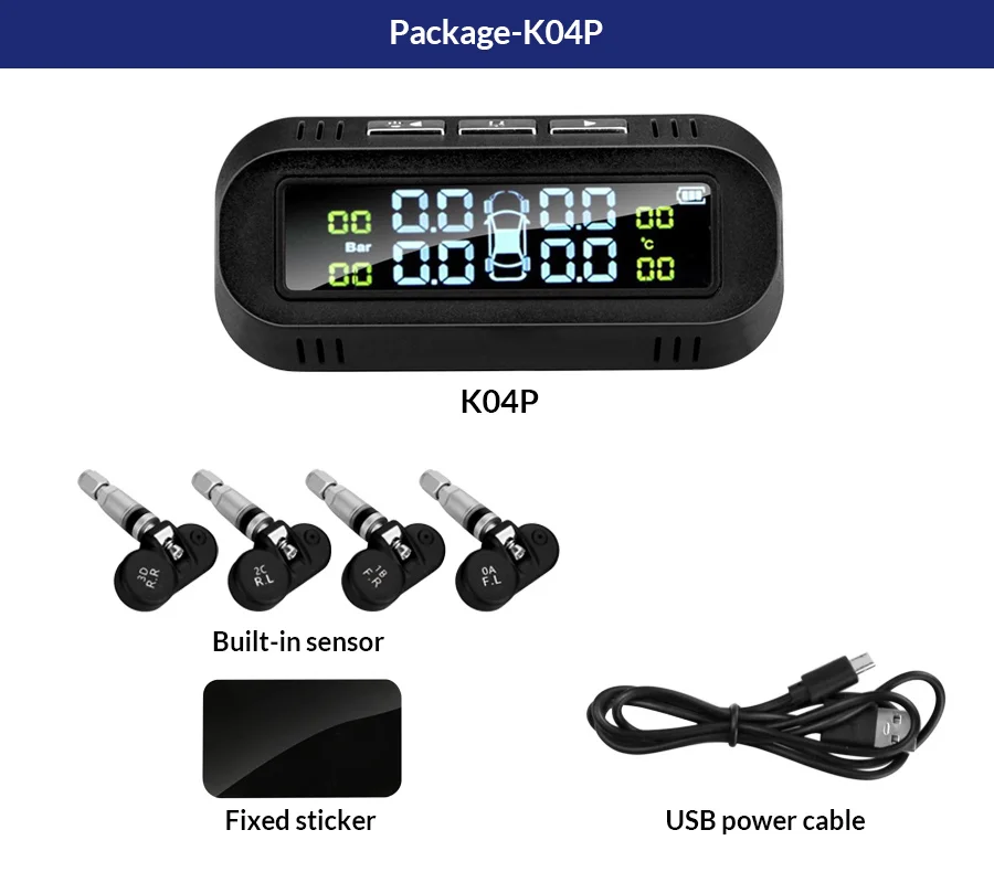 Давление в шинах K04 Обновлено,Датчик давления в шинах строго соответствуетС водонепроницаемым стандартом IPX7, и Он пересекает дорогу, как застойВода, адаптируется к различным погодным условиям, различным дорожным условиям, K04 может легко контролировать
